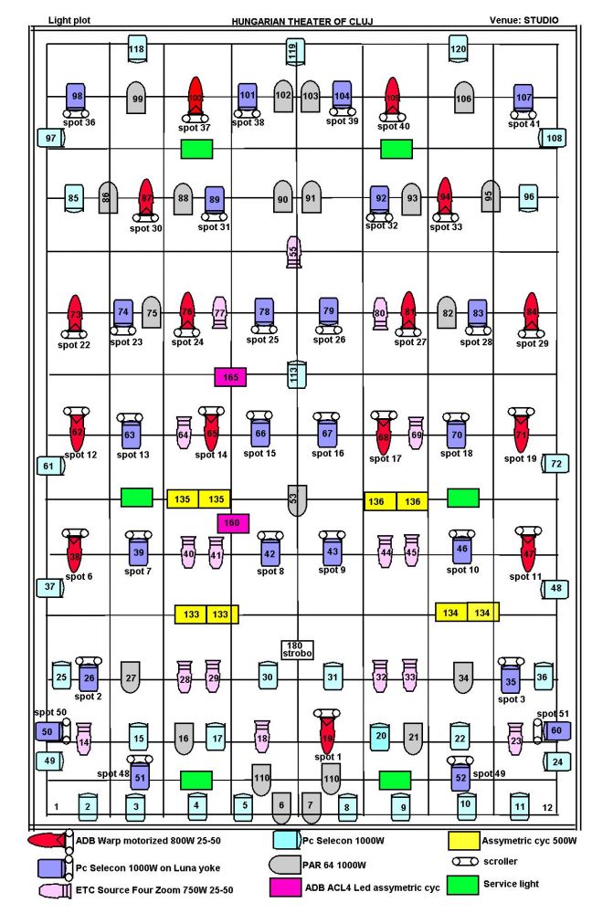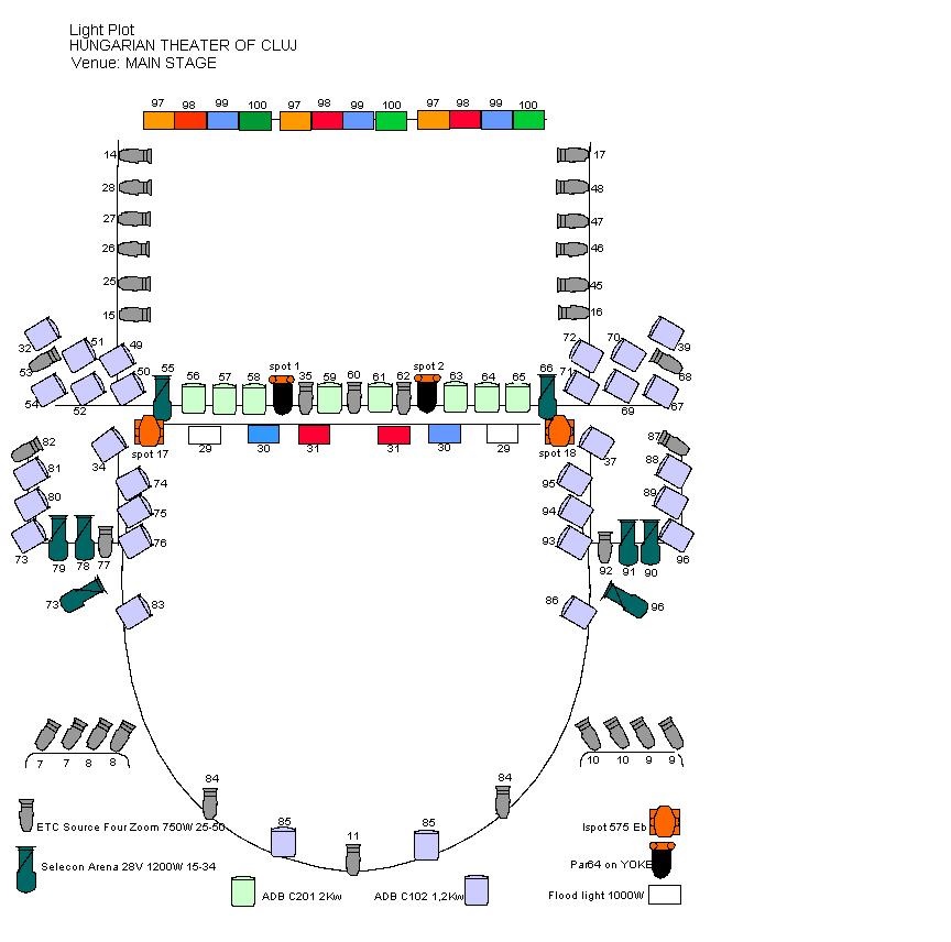 - oldalanként 4 PC 1000W Teatro, 2 profil Selecon 1200W (14°-28°) 1 profil ETC 750W (22°-50°), 4 Fresnel 1000W Teatro