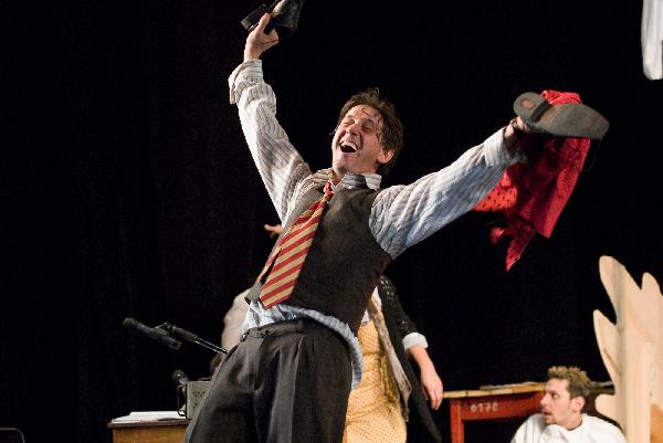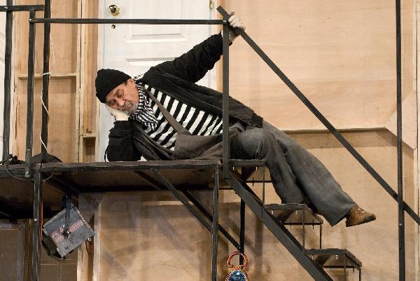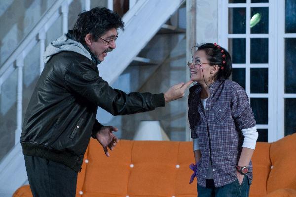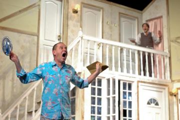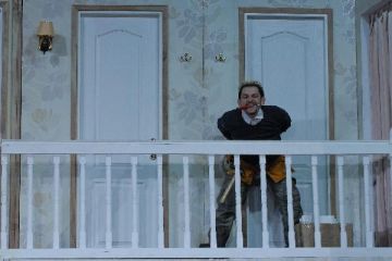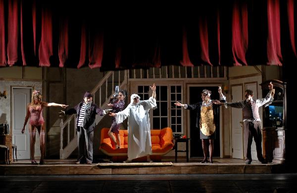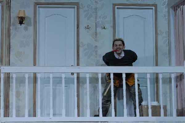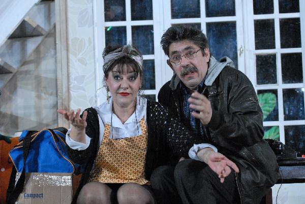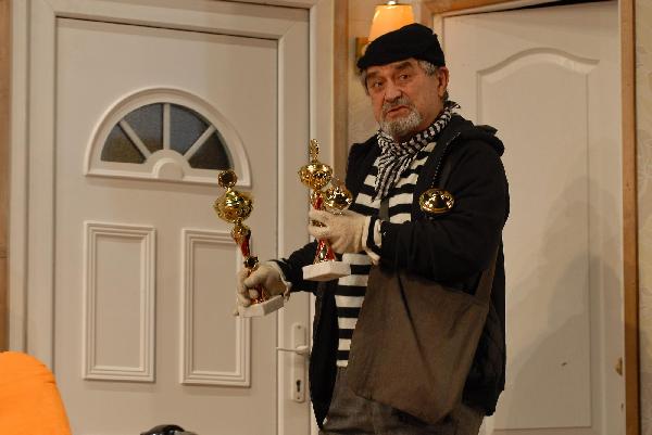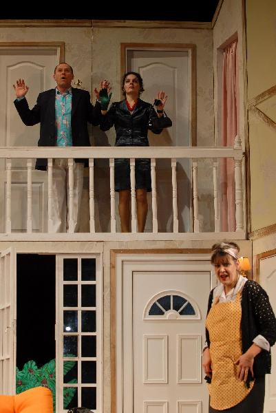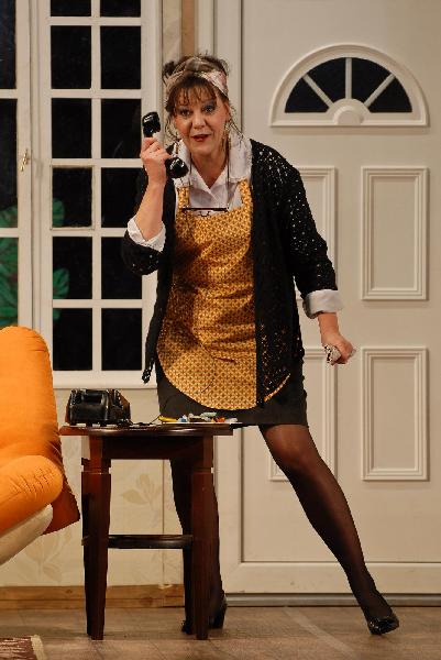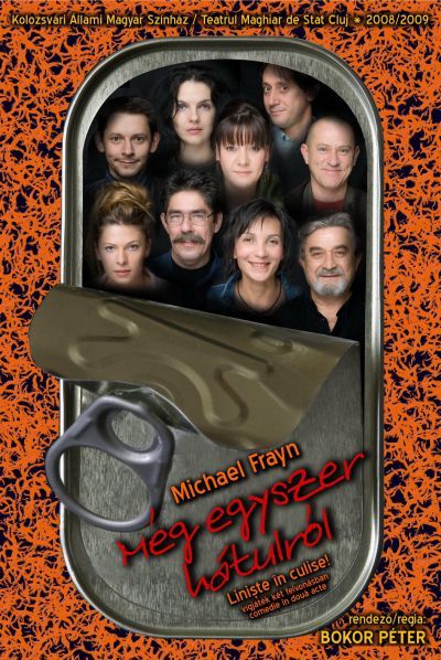A darab egy hisztérikus, de jóindulatú társulatot mutat be, amely a végletekig stresszelt rendező irányítása alatt egy olcsó vígjáték, az Ádámkosztüm bemutatójára készül. Michael Frayn műve egy kaotikus rendelkező próbától az utolsó, borzalmas bukással járó előadásig követi a színészeket; ezalatt az idő alatt ajtók csapódnak, románcok szövődnek, replikákat vétenek el, szívek törnek össze, makrélát lopnak – egyszóval, teljes a zűrzavar.