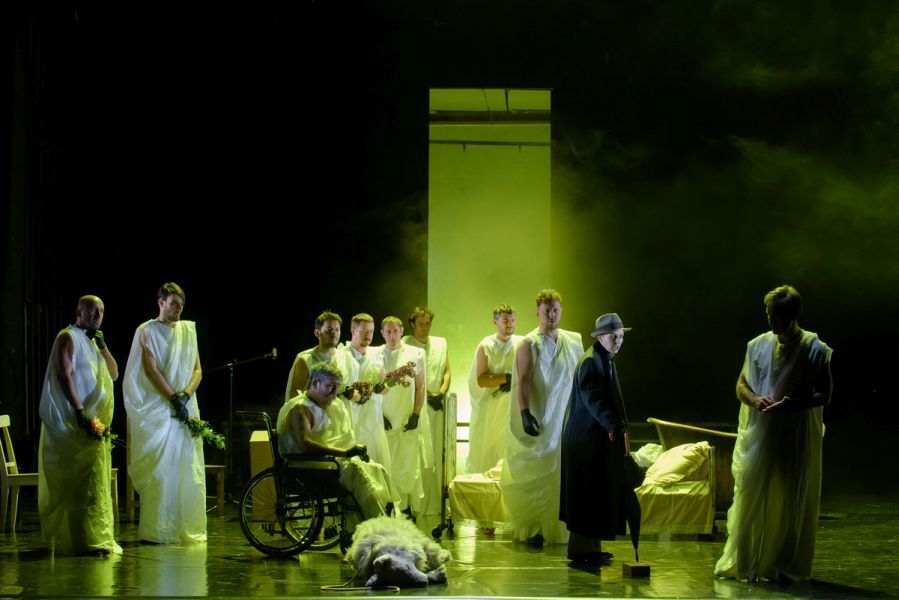 Purcărete fokozatosan „eloldja mind a háború kutyáit” az előadás folyamán. Ami a hoszszas, feszültségteli várakozás és előjáték után szemünk elé tárul a felszaladó vasfüggöny mögött, az egyszerre tablószerűvé komponált és szervesen, komótosan hömpölygő. (...) Valamiféle homályos, nyomasztó álmainkból ismerős rituálé zajlik a szemünk előtt. A szereplőgárda szimultán jelenléte a színpadon, a fókuszváltásokkal történő jelenet szerkesztés, a fehér, fekete és vörös színek elemi alkímiája eltereli az arcokról, a színészi átélésről, de olykor még a szöveg értelméről, érthetőségéről is a figyelmet. Fontosabb a hangzás, a hétköznapiságtól enyhén elemelt, leheletnyit ünnepélyes poétikum.