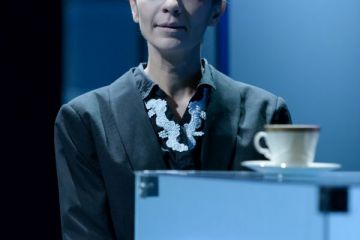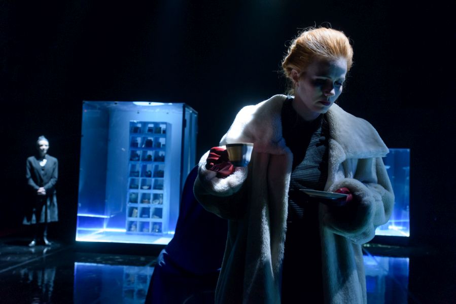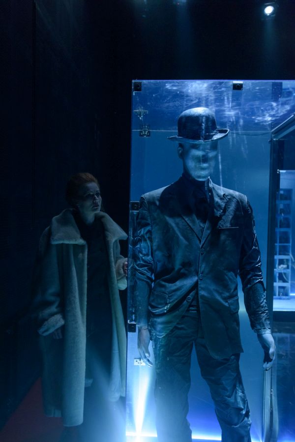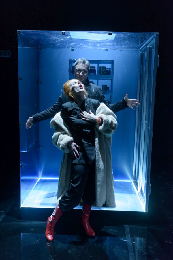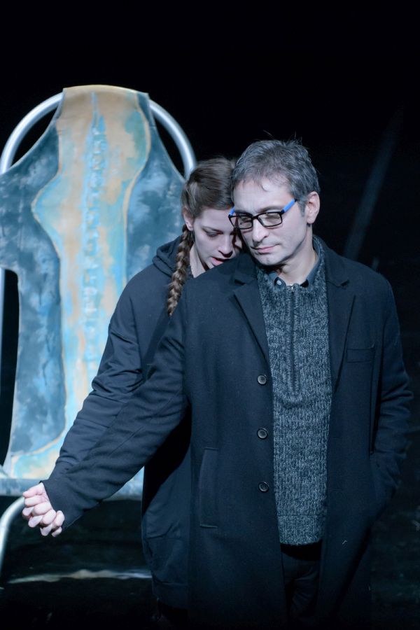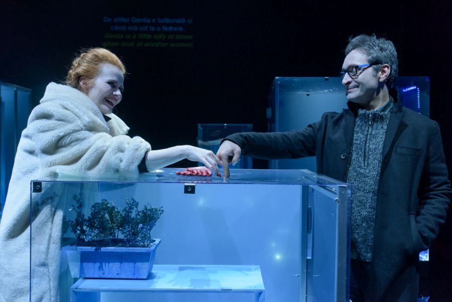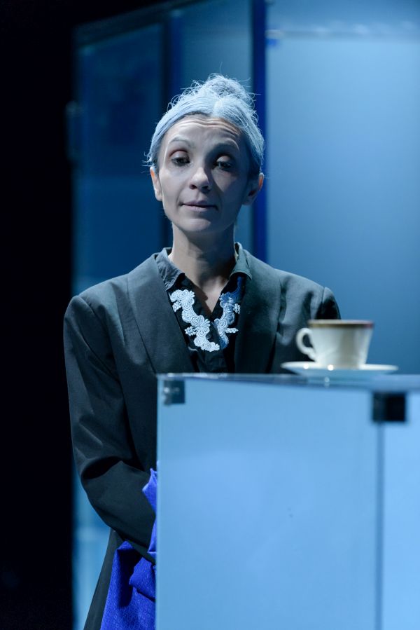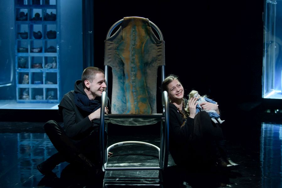 Vizualitásában volt legerősebb a produkció (díszlet- és jelmeztervező: Carmencita Brojboiu). A színpadkép a hideg színekre, az éles fény-árnyék hatásokra, a tükröződésekre és az áttetsző felületekre épített. Egy valós kapcsolatokból kifogyó család rideg nappaliját láttuk; a történetben az anya (Kézdi Imola) családja iránti érzéseinek hiánya rajzolódott ki, amihez a hideg kék árnyalatai remekül illettek. A szobában minden tárgy üvegbe volt burkolva, kivéve egy hintaszéket, amelyben az apa meghalt. Ezen a hintaszéken bukkantak fel egyedül földszínek és organikus formák – utalva ezzel a pozitív apafigurára, az ő természetes, valós személyiségére, amely a párbeszédekből egyértelművé és meghatározóvá vált. (…) A hintaszék több szempontból is fontos. A tér közepén van, folyamatosan fenntartja az apa emlékét, jelenlétét, az az egyetlen szabadon hagyott tárgy – a többi üvegbe burkolt elem a kirakatok és kiállítások hangulatát, minőségét idézi. Kirakat-élet, kirakat-szeretet, kirakat-anya: a szándék és a jelentés egyértelmű, a díszlet talál. A hintaszékben cserélődnek az emberek. Mindenki sorban odaül az apa egykori helyére: mindenki egyenként megérti az ő helyzetét, átlátja az eseményeket. A fizikai pozíció és az anyával kapcsolatos nézőpont összefonódik.