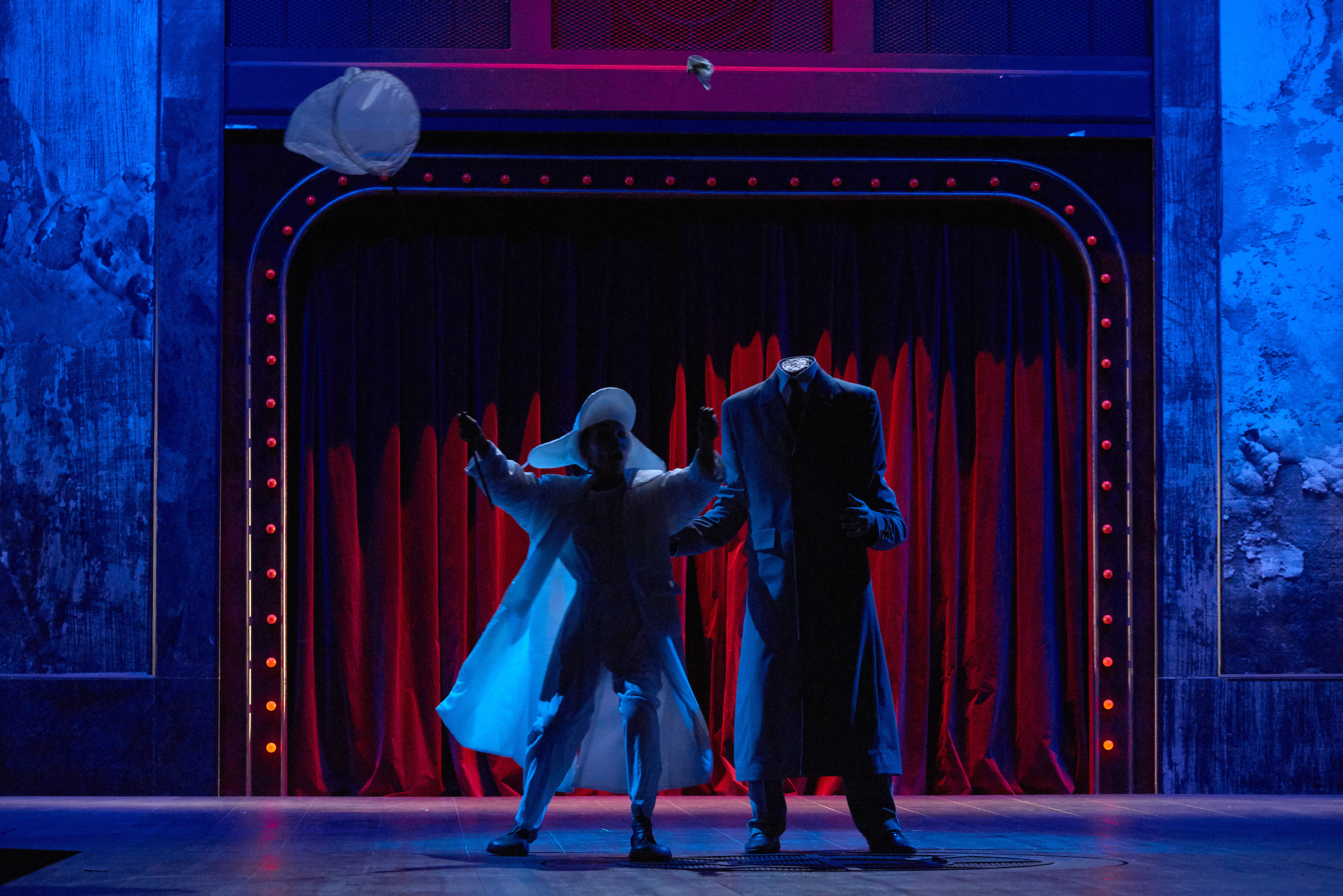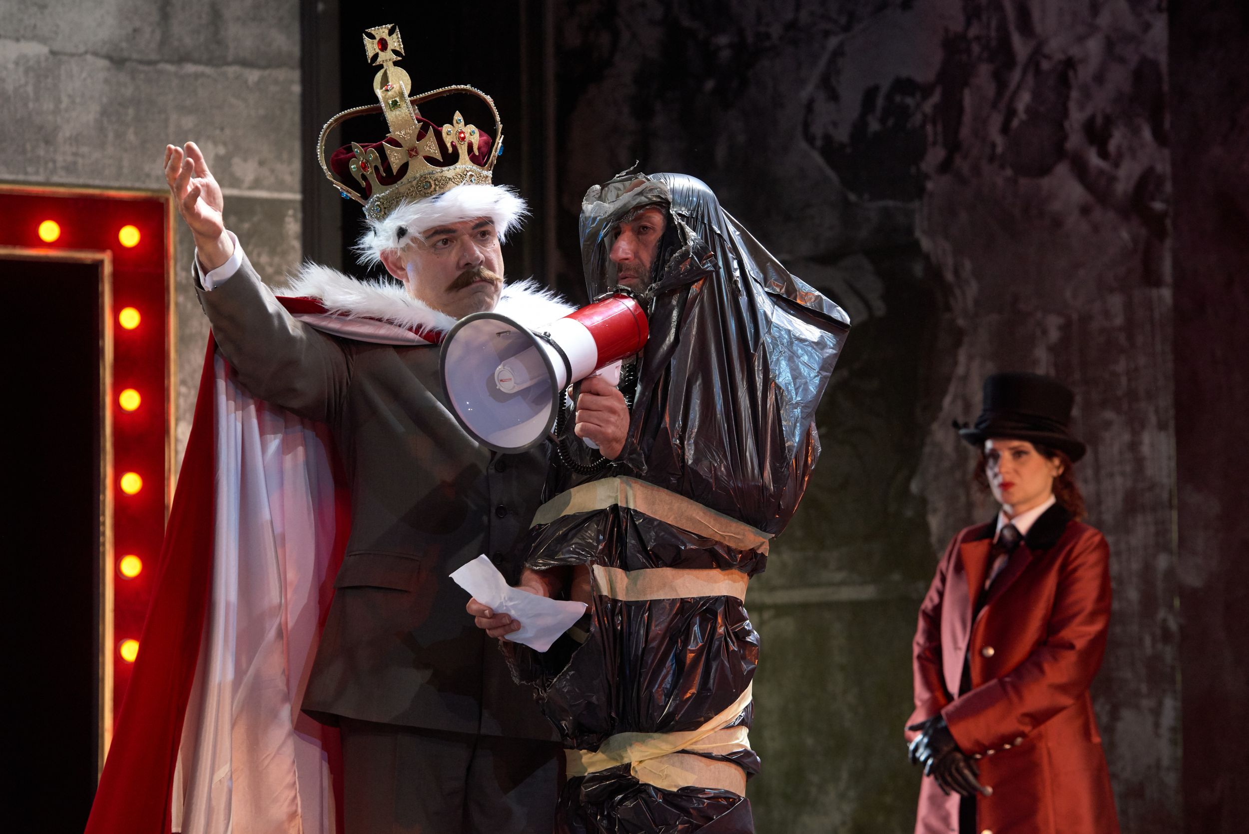 A szereplővé előlépő, hangulatokat és érzelmeket megjelenítő fény: fehér – hideg, semleges, kék, zöld – a tudatalatti, álomszerű sík; a monokromatikus és szinkronban mozgó kollektív szereplők, mint a gesztusok és replikák automatikus ismétlődése; a bohóc a keménykalappal, magányos figura és ugyanakkor a drámai jelenetek összekötője; naturalista elemek groteszk vonásokkal, nejlonzacskókba rejtett véres fejek, papírkorona és egy játékos, valószínűtlen, karikaturisztikus, gyerekszékhez hasonló miniatűr trónus – az előadás vizuális-költői univerzuma ezekből tevődik össze. Szuggesztív elemek és színpadi effektusok, amelyek Vasile Șirlinek az operazenétől a kabarézenéig terjedő zenei kompozícióival együtt hol Magritte álomvilágába repítenek (a fejetlen keménykalapos ember táncol a pillangóhálós emberrel), hol Alfred Kubin kietlen, expresszionista világába (a trónterem falait beborító rajzok), hol a szocialista realizmusba (a világot uraló emberek képe, de ironikus módon Einstein, Chaplin és végül Ionesco képével váltakozva).