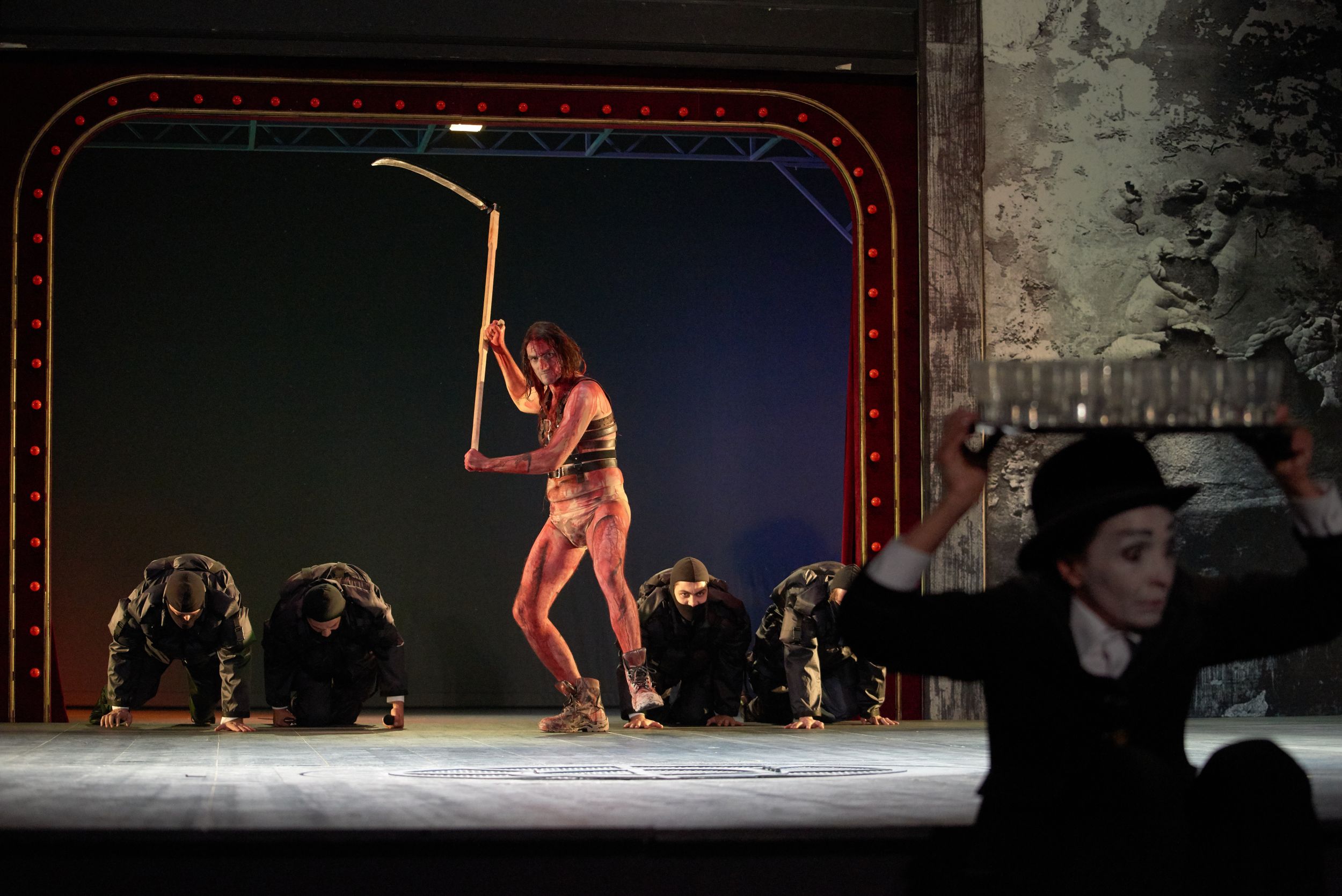 Az előadás felgyülemlésre és ismétlődésre épül, ezáltal jelezve a gyilkosságban való egyenlő részvételt. Az egyéni vonások eltűnnek, és helyükbe a minden, illetve tulajdonképpen a semmi amorf, egynemű masszája lép. Teljes valójában testesül meg az önkívületbe hajló szatíra, azaz a szerző által a történelemhez és a bikkfanyelvekhez rendelt folyamat, amely olyannyira jellemző minden zsarnoki rendszerre, legyen az Hitler, Sztálin, Mao, avagy Ceașescu.