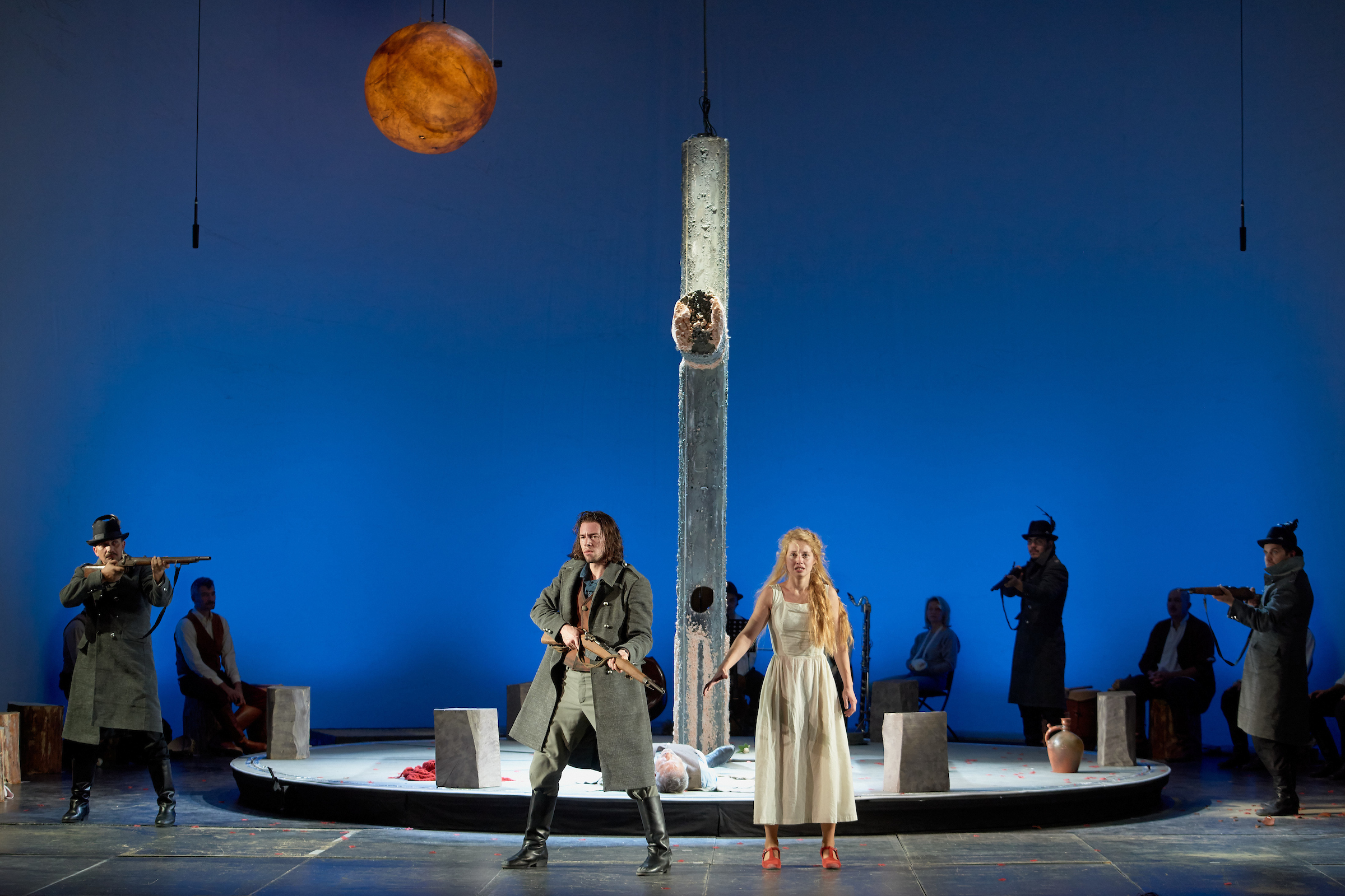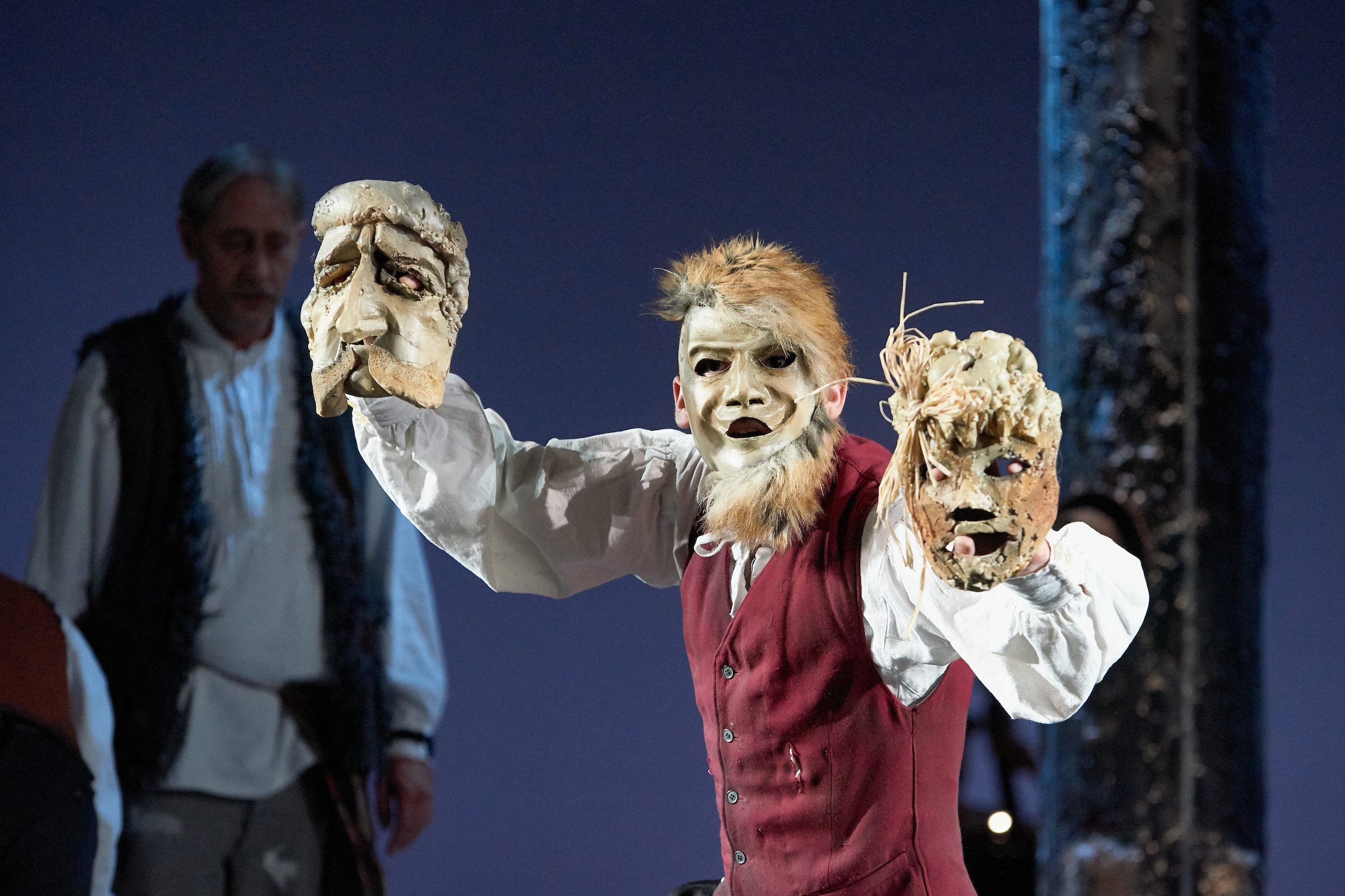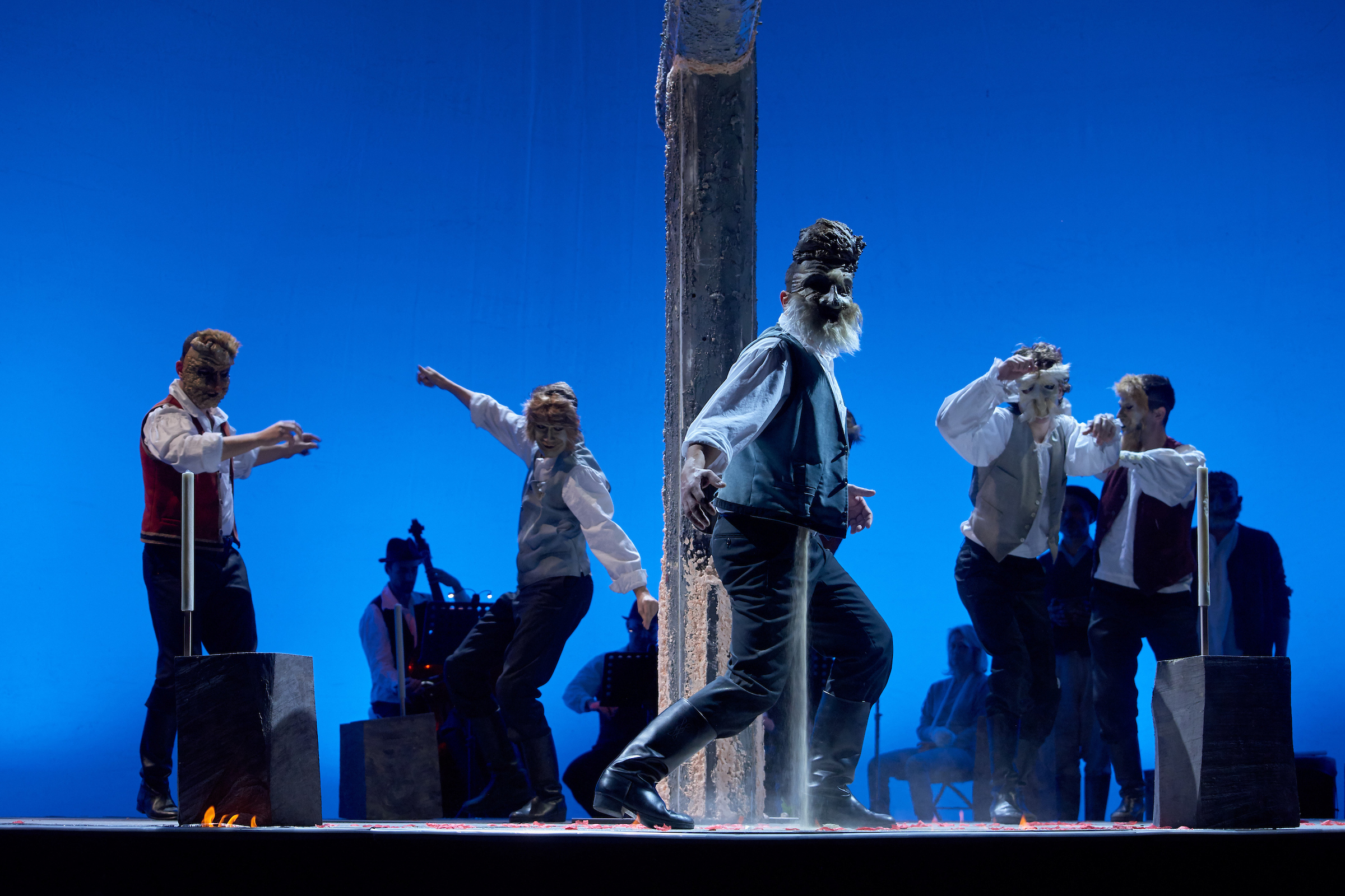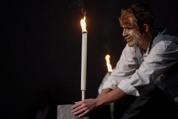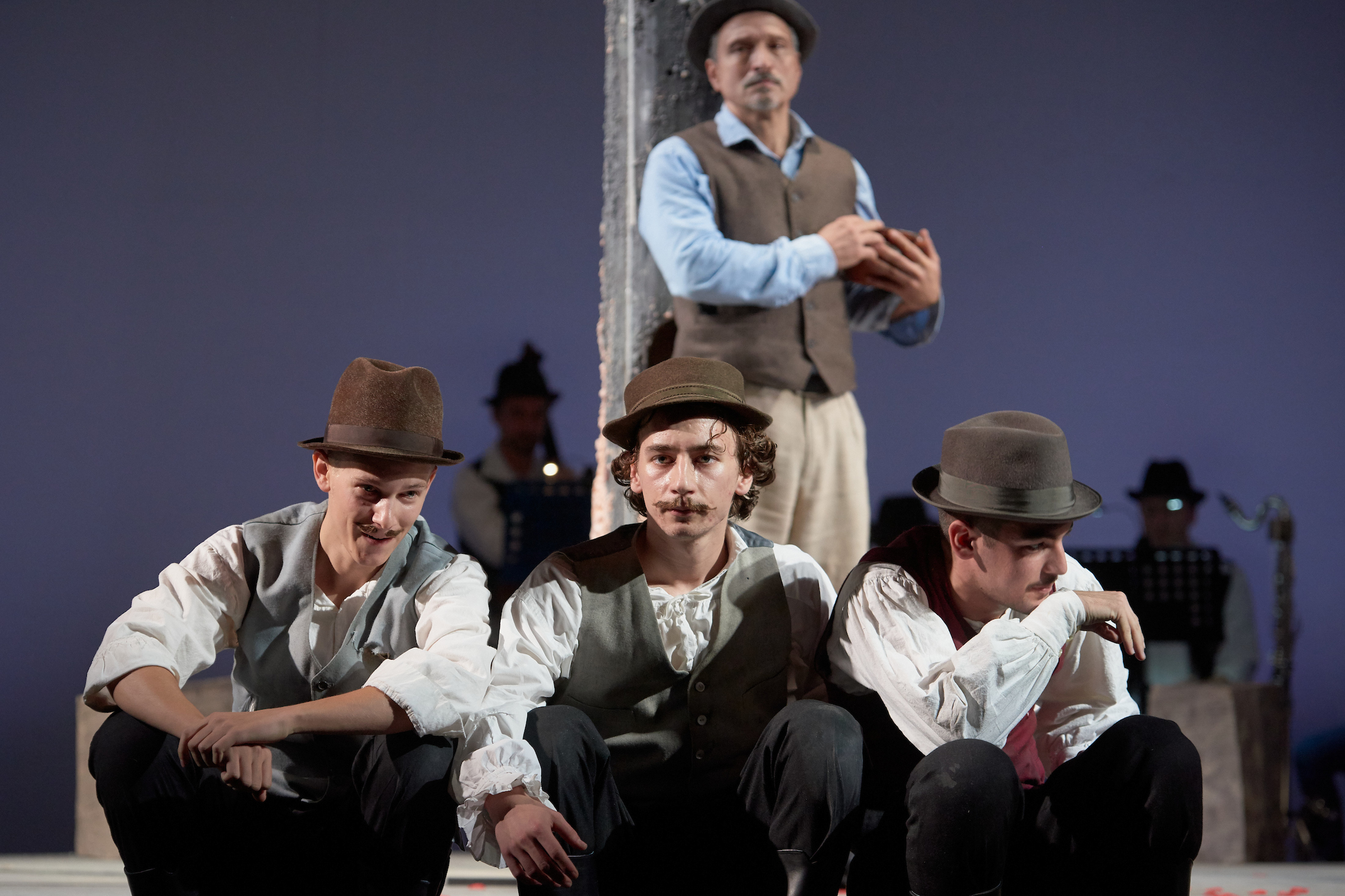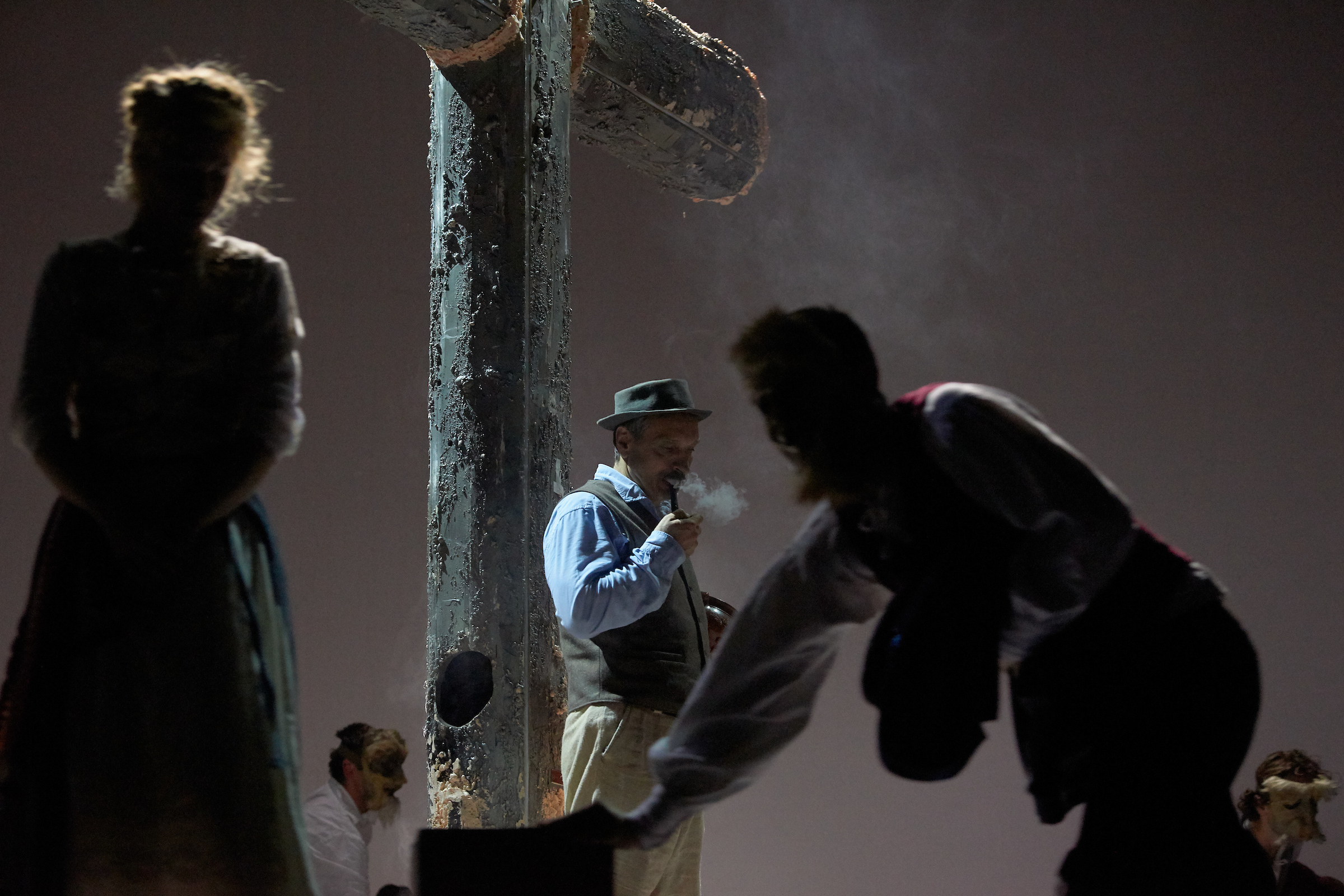 Az, hogy Csorja Ambrus (Orbán Attila) karjaiból hirtelen, de nem leomlón, inkább ránduló darabosan megy ki minden erő, távozik az élet, egyetlen gesztusba sűríti Csorja Ambrus egész addigi életét. Az, ahogy ülve hal meg, egyik pillanatról a másikra, a további eseményeket, Csorja Ádám (Bogdán Zsolt) további cselekedeteinek gyorsaságát is magyarázza, miként azt a dramaturgiai módosítást is, hogy a halottat nem az ágyával együtt húzzák ki a színről, hanem úgymond saját lábán távozik. Ez a saját lábon távozás pedig azt a lehetőséget is felvillantja, hogy akik a maszkban és álarcban járnak, akiknek arca már merev és mozdulatlan, ugyanolyan halottak, mind a hajdani nagy erejű Csorja Ambrus, az utolsó, aki még kapcsolatban áll a hagyomány forrásaival. Más hagyományok is felbukkannak az előadásban, a halottsiratásé, a közös imáé, a katonának álló legények táncáé. Mindezek segítenek, segíthetnének abban, hogy a Tamási szövegében rejlő utalásokat, a mindenkori hagyomány jelentőségét, a megőrzés fontosságát megélhessük, átélhessük.