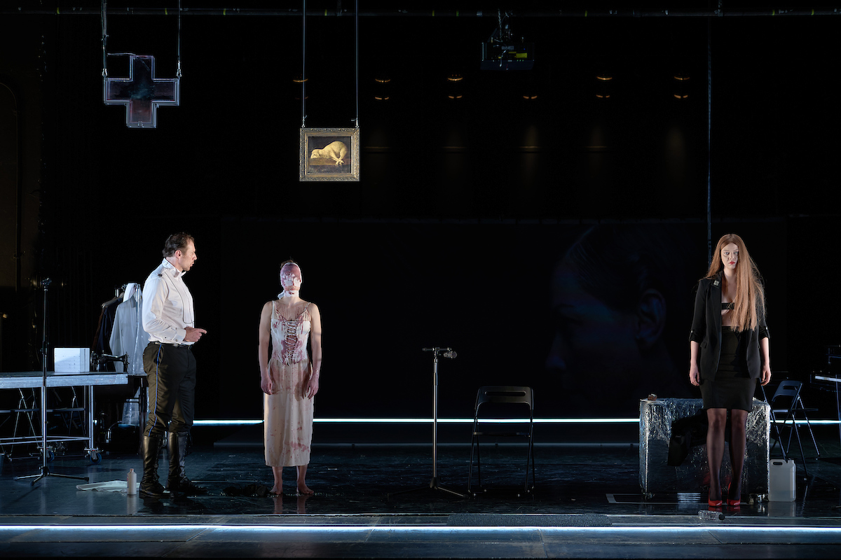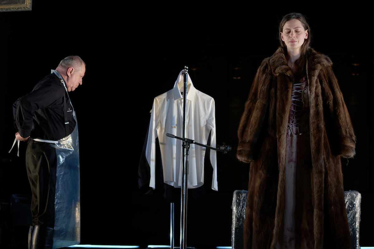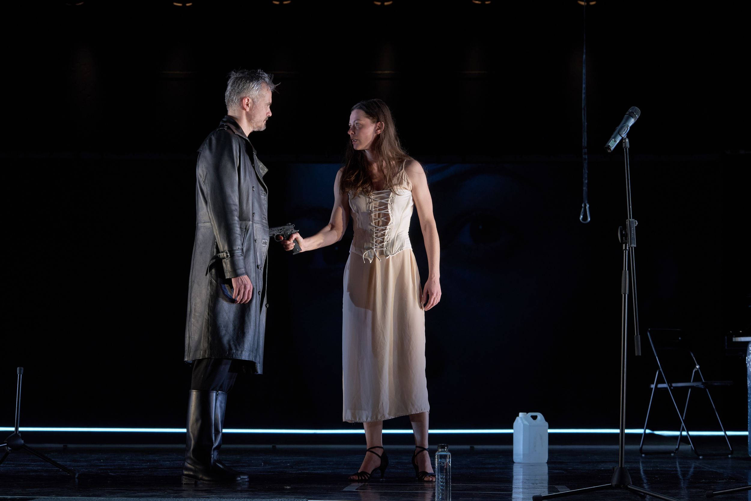 A közönséget már belépéskor üdvözlő, a csupasz falak, néhány fémasztal és -szék, a csövön függő jelmezek és mikrofonállványok jelezte színpadtechnikai küllem (melynek a rendező egyben díszlettervezője is) a politikai manőverek „kulisszáinak” időtlenségébe helyezi a történelmi témát. Diego De Brea szlovén rendező a jelen témái felé nyitott előadást kínál fel, utalva a politikai szövetségek és árulások gyakorlatára, rideg esztétikával, a szereplők társadalmi álcája alatt fortyogó személyes megélések feltárására összpontosítva. A színpad fölött függő, Zurbaran Agnus Deijének keretestül reprodukált festménye már a darab első soraitól kezdve az áldozathozatal motívumát helyezi kilátásba, kulturálisan összecsengve a Vadászok a hóbannal, Idősebb Pieter Bruegel Stuart Mária gyónását kísérő festményével. A festmény mellett lógó üres, keresztet formázó üvegcse VIII. Henrik Angliájának protestáns reformációját idézi fel Schiller darabjának bonyodalmi gócaként. A színpad és a közönség jelenében a szakrális művészetből kölcsönzött képek emlékeztetnek rá, hogy a történelem folyamán az ártatlanokat mindig feláldozzák, ám közvetlen utalást is tesz az anglikán protestánsok és a katolikusok történelmi küzdelmére. Az Anglia trónja fölötti viszály szülte szövetségek és árulások bonyolult szövevényében Diego De Brea rendező Stuart Mária sorsából „Krisztus passiójának női változatát” olvassa ki, amint azt a műsorfüzetben is kijelenti.