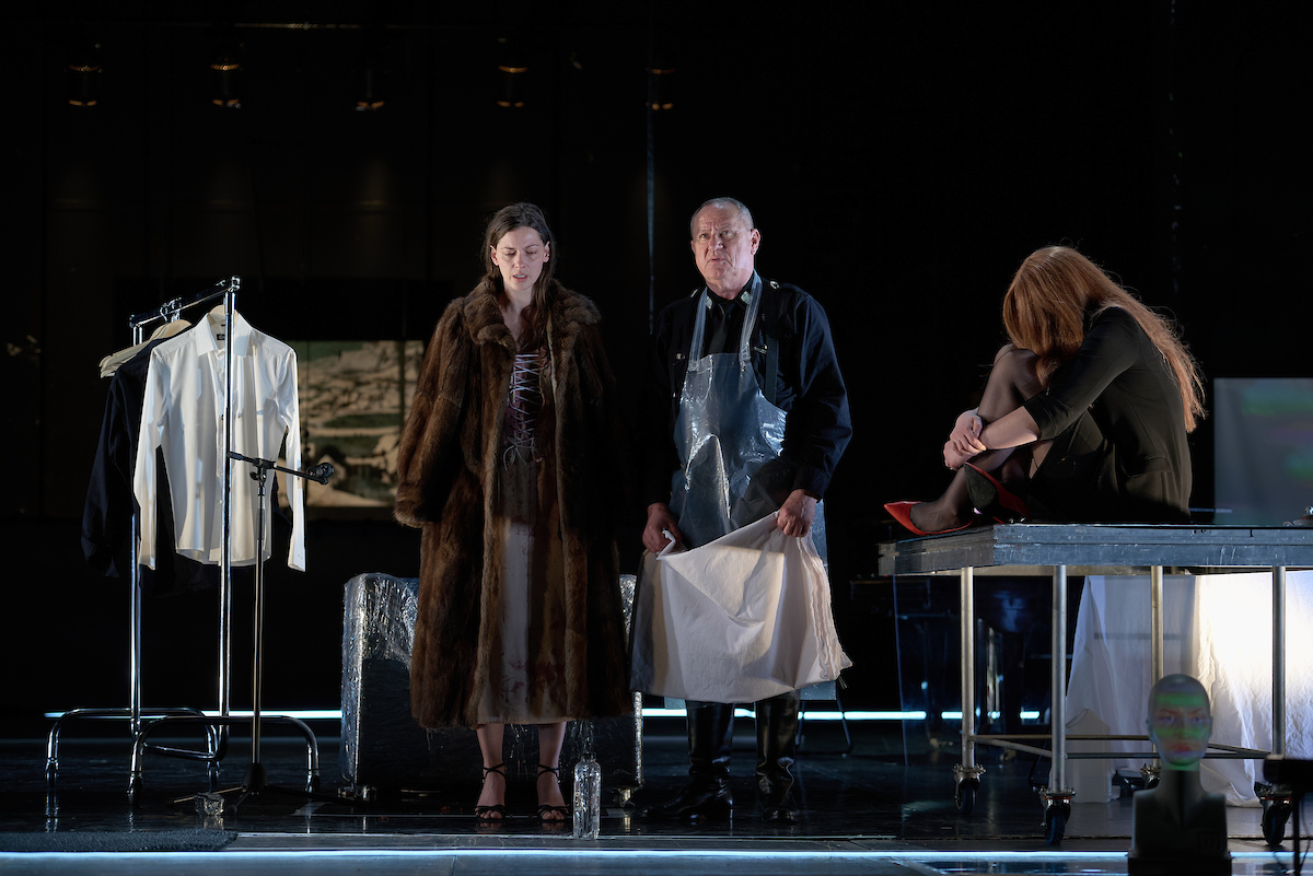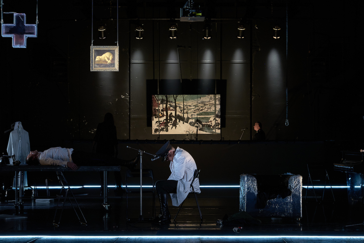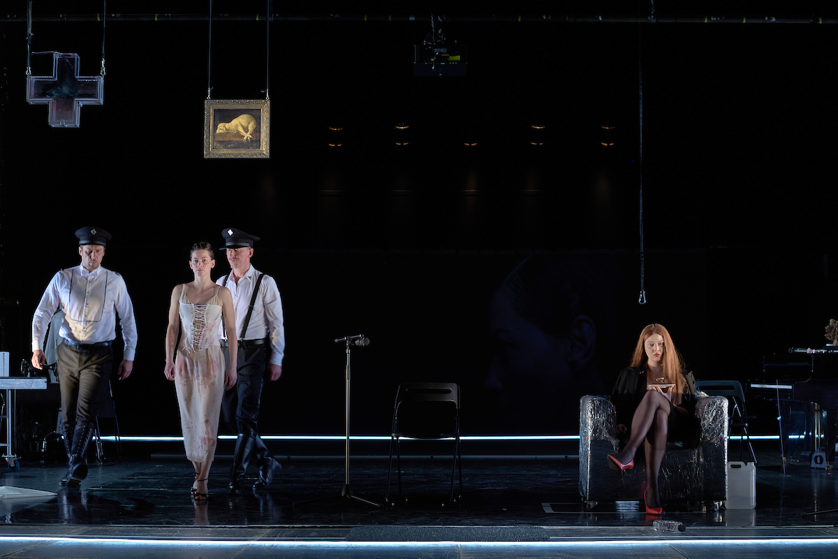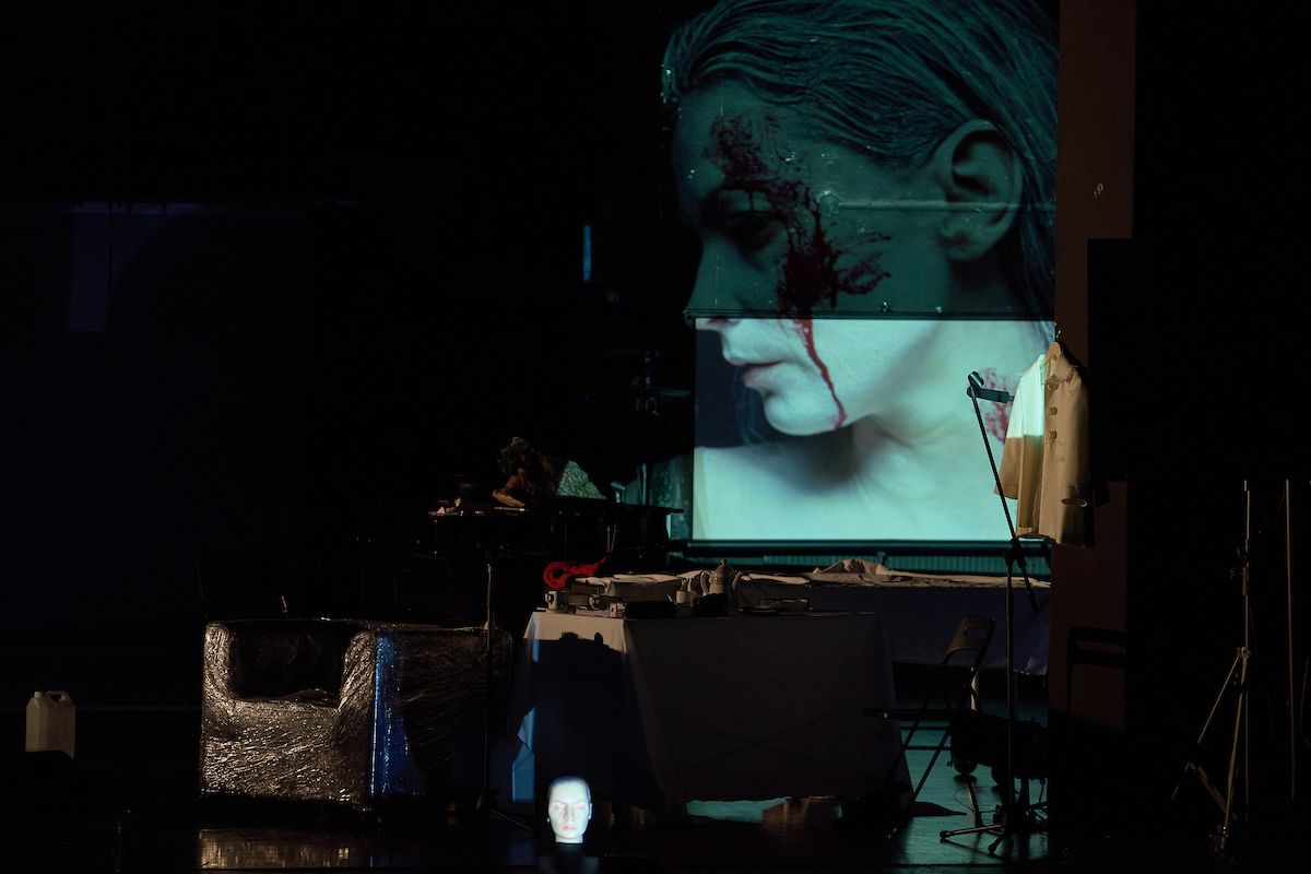 A közönséget már belépéskor üdvözlő, a csupasz falak, néhány fémasztal és -szék, a csövön függő jelmezek és mikrofonállványok jelezte színpadtechnikai küllem (melynek a rendező egyben díszlettervezője is) a politikai manőverek „kulisszáinak” időtlenségébe helyezi a történelmi témát. Diego De Brea szlovén rendező a jelen témái felé nyitott előadást kínál fel, utalva a politikai szövetségek és árulások gyakorlatára, rideg esztétikával, a szereplők társadalmi álcája alatt fortyogó személyes megélések feltárására összpontosítva. A színpad fölött függő, Zurbaran Agnus Deijének keretestül reprodukált festménye már a darab első soraitól kezdve az áldozathozatal motívumát helyezi kilátásba, kulturálisan összecsengve a Vadászok a hóbannal, Idősebb Pieter Bruegel Stuart Mária gyónását kísérő festményével. A festmény mellett lógó üres, keresztet formázó üvegcse VIII. Henrik Angliájának protestáns reformációját idézi fel Schiller darabjának bonyodalmi gócaként. A színpad és a közönség jelenében a szakrális művészetből kölcsönzött képek emlékeztetnek rá, hogy a történelem folyamán az ártatlanokat mindig feláldozzák, ám közvetlen utalást is tesz az anglikán protestánsok és a katolikusok történelmi küzdelmére. Az Anglia trónja fölötti viszály szülte szövetségek és árulások bonyolult szövevényében Diego De Brea rendező Stuart Mária sorsából „Krisztus passiójának női változatát” olvassa ki, amint azt a műsorfüzetben is kijelenti.