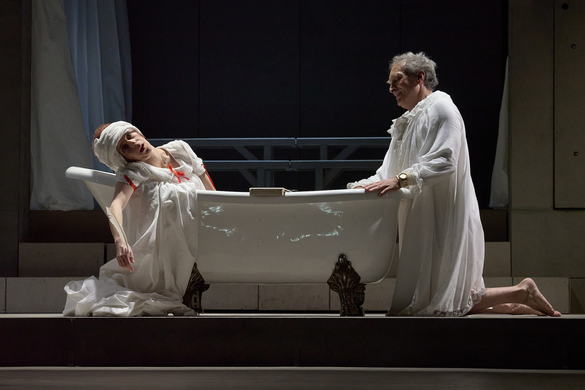 Van azonban valaki, aki egyedül a férje előtt játssza meg magát, különben mindenkinél, ráadásul rafináltan romlottabb, és a romlottságát nem is titkolja: maga Jusztinia, azaz Elena. Ő az, aki Albert Csilla tökéletes színpadi alakításának hála felvázolja az egyik legfontosabb, és a jövőre nézvést legvészjóslóbb forgatókönyvet: azt, hogy mindebből az ő és a férje bukása után nem lehet más, csak demokratikus pornokrácia vagy pornokratikus demokrácia. S mintha még örülne is mindannak a posványnak, amit maga után hagy. S amit Konsztantinosz is lát, de a látását ekkorra már elhomályosítja a hatalom megszerzésének lehetősége…
