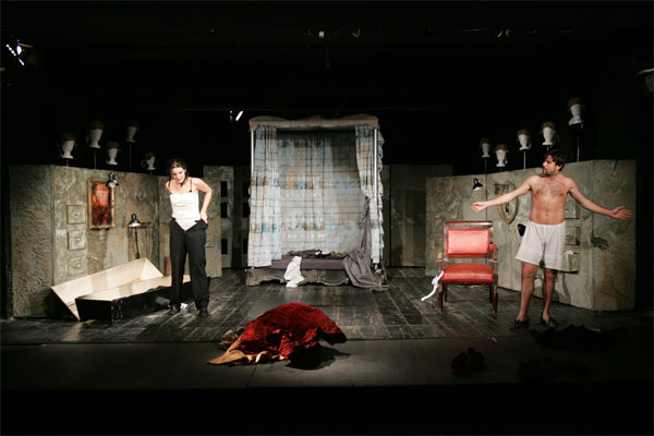 A német drámaíró pontosan meghatározza a helyszínt: „szalon a francia forradalom előtt, vagy bunker a harmadik világháború után”. A szöveg virtuozitása mindkét színész részéről különleges hozzáállást igényel, hiszen az előadás folyamán több szerepet is el kell játszaniuk, ráadásul egymás között váltogatják a nemeket s szerepeket, és mindennek a tetejébe, ott az átütő erejű, színházi nyelven megfogalmazott, jól artikulált szöveg, illetve annak gyilkos humora.