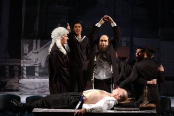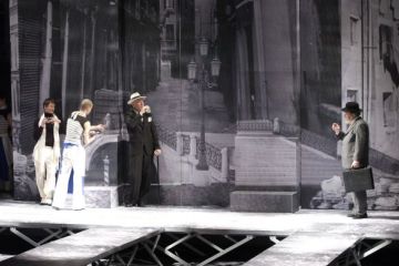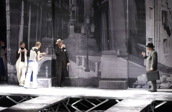 „Egon Savin rendező radikálisan oldotta meg a kérdést, hogy milyen műfajhoz tartozik Shakespeare darabja, azáltal hogy hangsúlyozott mértékű aktualitást adott neki. Nem képeslap-szerű díszletet választott az események hátteréül, hanem Tabacko kiemelkedő tájleírását az örök Velencéről – pompás és titokzatos végtelen leépülésének képét. Mindazonáltal Kristina Ignjatovic´ élénk jelmezei és a Shakespeare szövegéből természetesen fakadó sugallatok révén a rendező az 1930-as évek Olaszországába helyezte a cselekményt. A korba, amelyre rávetült a közeledő fasizmus árnyéka, amelyet megmérgezett a rasszizmus, az idegengyűlölet, az erőszak és a törvény semmibevétele. Számára Shylock (Predrag Ejdus) nem komikus szereplő és nem is groteszk vagy ördögi, mint inkább egyszerűen egy megalázott, kétségbeesett ember, aki készen áll arra, hogy fausti szerződést kössön magával az ördögge, csak azért, hogy visszanyerje az önbecsülés morzsáját, elveszett méltóságát, hogy igazságosabban értékelhesse önmagát.“