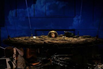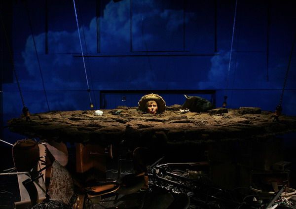 At the beginning of the performance, Winnie is embedded in the ground only up to her chest. By the end, she will be buried neck-deep. She speaks. Her man barely says a word. Winnie marks the small celebrations of the everyday. And, whatever happens – or rather, despite the fact that nothing ever happens – she keeps her optimism to the end: ”Oh, this is a happy day, this will have been another happy day… After all.” Winnie constantly feels that time is passing, but she tries to bring out the best from what is left. The performance focuses on two levels, an earthly one and a transcendental one. Meanwhile, behind the constant threat, there is an unceasing searching for the poetry of universal love.