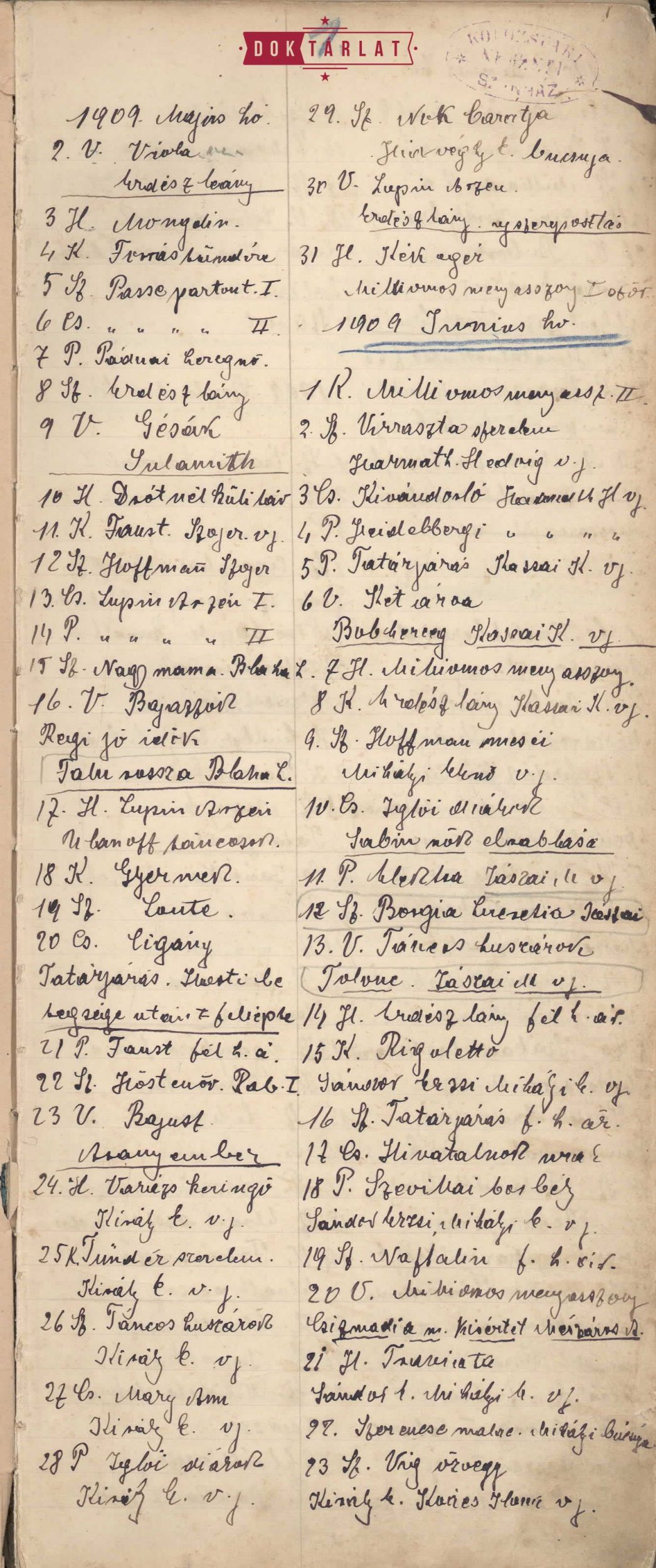 A Műsorkönyv 1909. május elejétől indul. Az íráskép azt mutatja, hogy ezt a könyvet nem a gyöngybetűkkel író Betegh László indította el. Feltehetően Parlaghi Lajos lehetett, Janovics Jenő első számú titkára. Néha egy-egy könyvvezető bejegyezte a nevét a könyvecskébe, így megtudjuk pl., hogy 1941. július 1-től Várady Rudolf könyvtáros feladata volt a napi előadások bevezetése. A 20x60 cm-es könyv borítójáról lekopott a cím, de az 1957. június végéig tartó bejegyzéseket más forrásokkal összevetve azt állapíthatjuk meg, hogy ez a könyv a kolozsvári színház műsorának igen precíz, lineáris nyilvántartása. A könyv egy-egy oldala függőlegesen két egységre lett osztva, az oszlopok egy-egy hónap előadáscímeit sorjázzák. A hónapok oszlopainak sorai a dátummal és a napok kezdőbetűjével indulnak. Jelölték a délelőtti (de), délutáni (du) vagy esti (e) előadásokat is, a bemutató majd a további előadások sorszámát pedig a címek utáni római számmal jelezték. A címek mellett rendszerint megjelenik a vendégszereplő művész neve is, amennyiben van ilyen. A kiszállásokat is bejegyezték. Ha a társulat egyik része közben itthon játszott, az illető napokat párhuzamosan jegyezték, beírva a kiszállás helyszínét is. Néha apró bejegyzéseket fedezhetünk fel, amelyek kissé többet is elárulnak a színház életéből: Például 1932. február 29-én, hétfőn „Miután közönség nem volt, az előadás elmaradt.” Vagy 1932. május 15-én, vasárnap az Antónia című előadásban „Fedák helyett Poór Lili [ugrott be], miután bevonták Fedák engedélyét.”