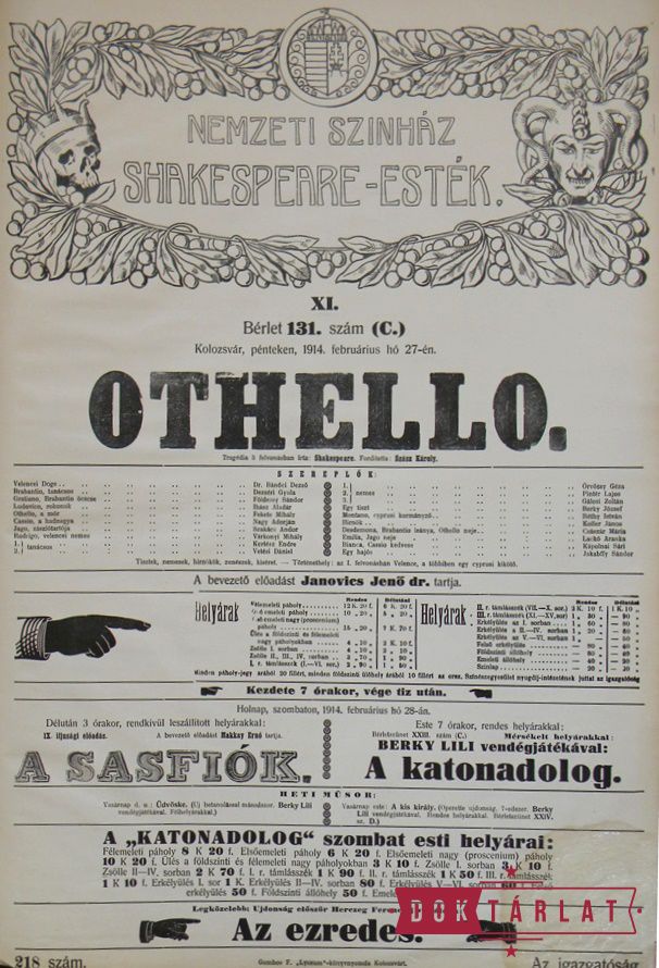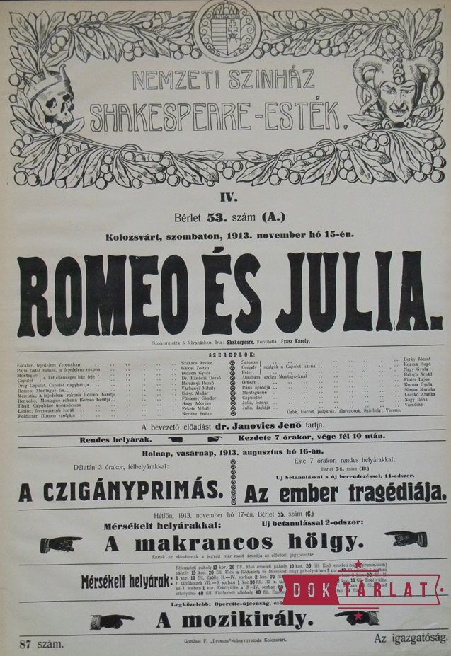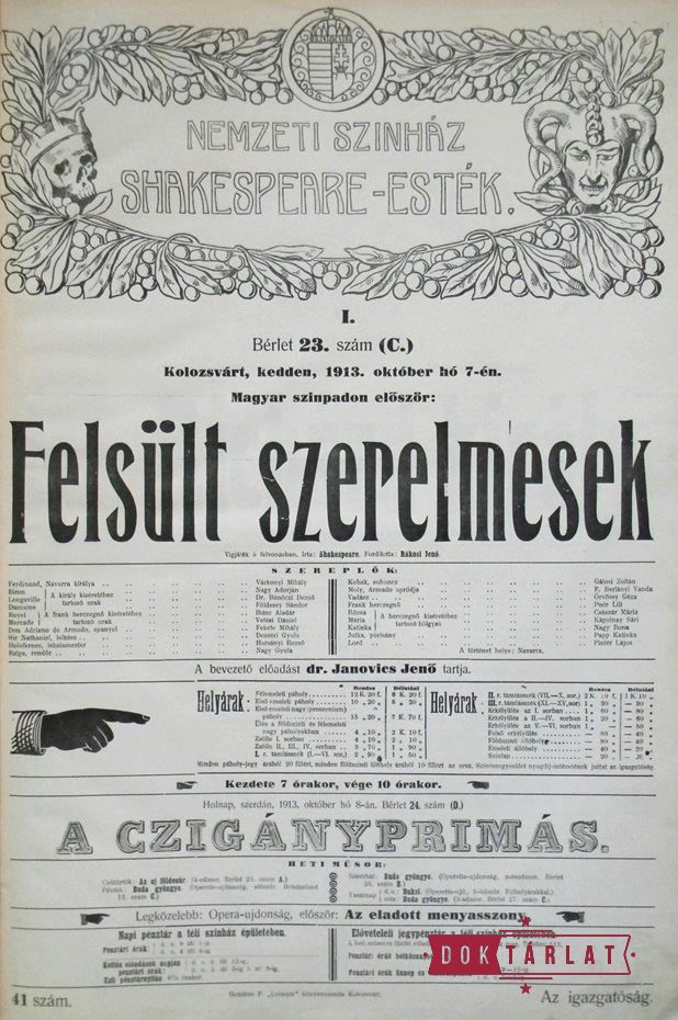 Az 1913-1914-es évadban dr. Janovics Jenő, a Kolozsvári Országos Nemzeti Színház igazgatója újabb merész vállalkozásba kezdett: Shakespeare-ciklust harangozott be, 15 bemutatót és 40 előadást. Ennek előzményei az 1911-12-es évadban megvalósult a magyar dráma történeti fejlődését bemutató 29 előadást tartalmazó ciklus, valamint az 1912-13-as évadban az antik drámák sorozata 9 igen sikeres előadás formájában. A tervet kétkedve fogadta a sajtó. A Kolozsvári Hírlap tudósítója (1913. aug. 24.) nemcsak a színház művészi erejét érezte kevésnek a nagyszabású feladathoz, de a közönség fogadókészségét is megkérdőjelezte. „Mi úgy véljük, hogy ez merész, vagy nem komoly vállalkozás, mert nemcsak nálunk, de még a budapesti nemzeti színháznál is képtelenség egy szezonban jól, kellő készültséggel, korhű berendezéssel, és általában stílusosan tizenöt Shakespeare darabot lejátszani. (...) Mert őszintén szólva, nálunk nem annyira negyven, mint inkább négy jó Shakespeare estére volna szükség. És erre még komoly közönség is akadna.” A sajtó fenntartásai azonban nem bizonyultak indokoltnak. 1913. október 7. és 1914. április 23 között 35 este játszottak Shakespeare-t a Kolozsvári Országos Nemzeti Színház színpadán, Janovics Jenő rendezésében. Ez 14 Shakespeare-mű bemutatóját jelentette. Ezek között a Felsült szerelmesek című vígjáték magyar színpadon ekkor került először színre. A 9. bemutató, az 1914. január 25-én sorra kerülő Hamlet címszerepét maga az igazgató játszotta. Janovics Jenőnek ez volt az egyik legkedvesebb szerepe.