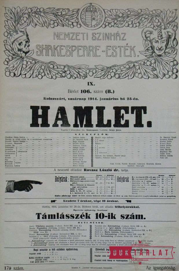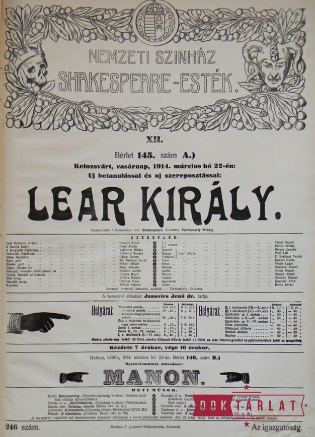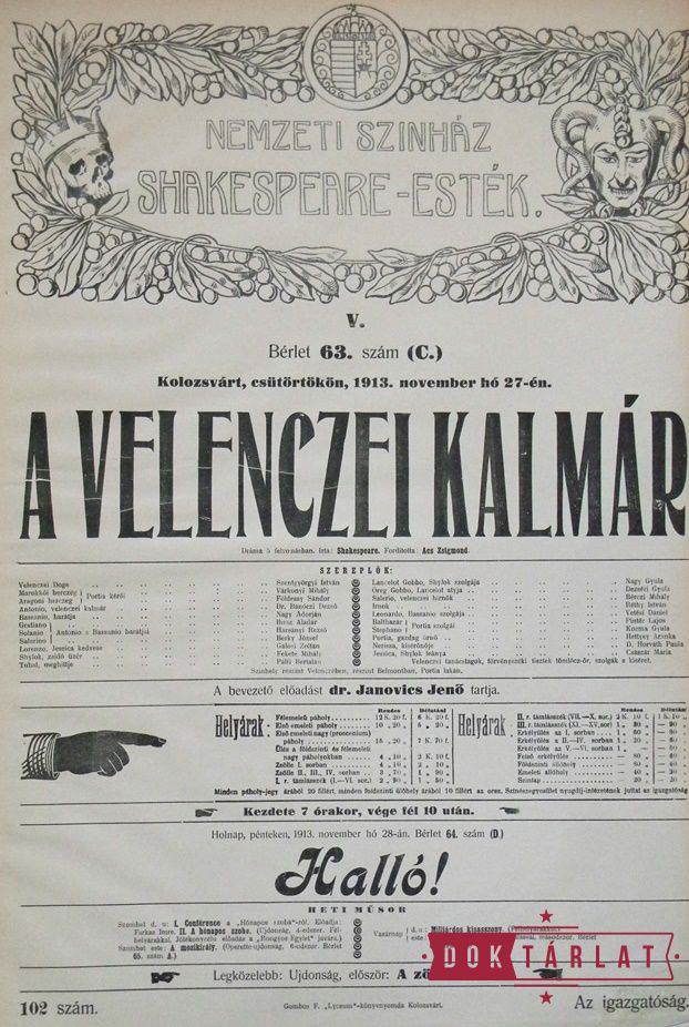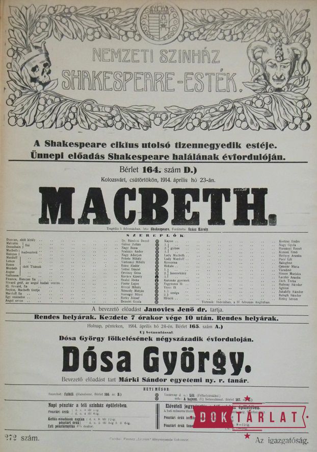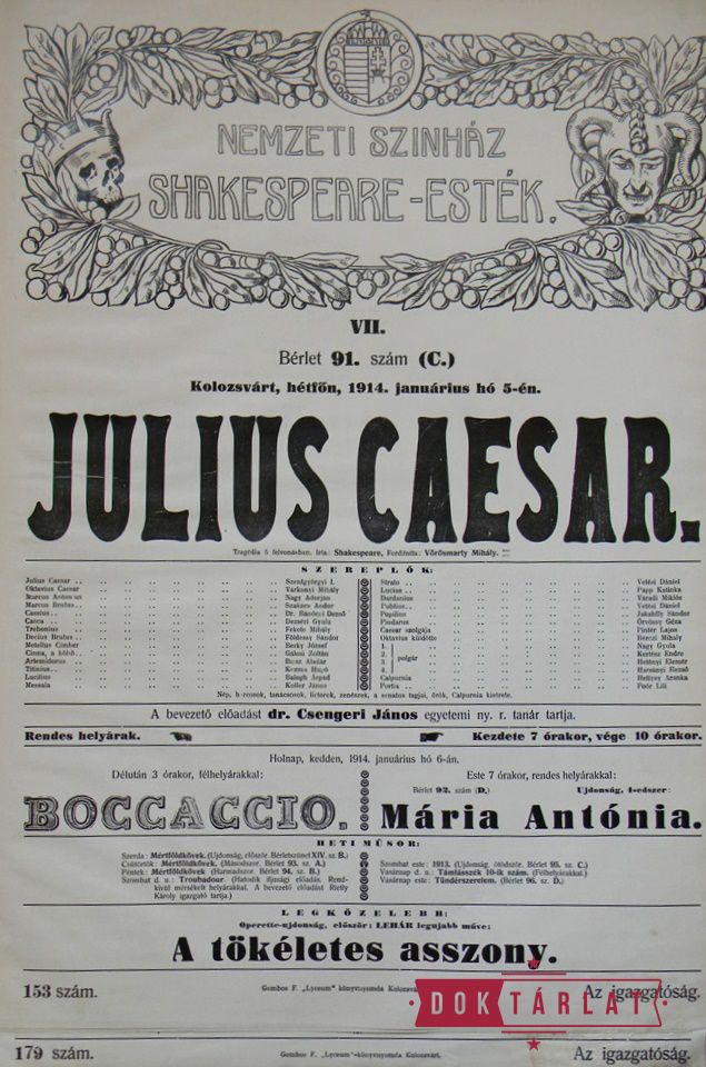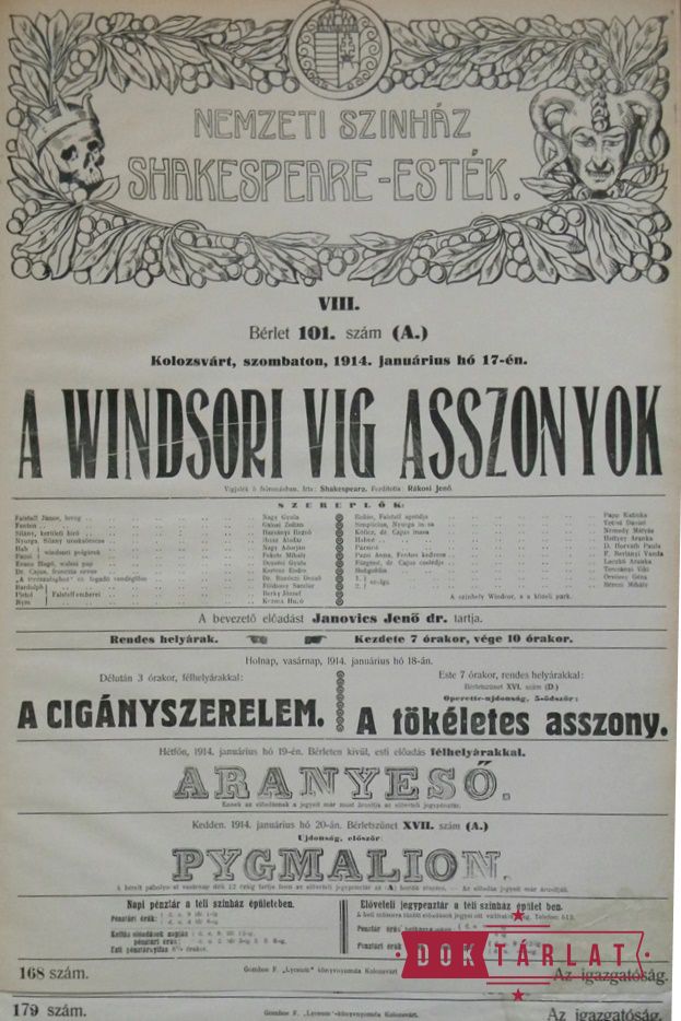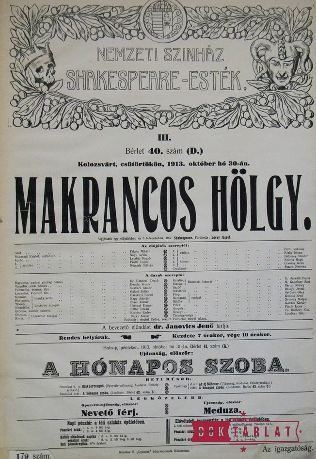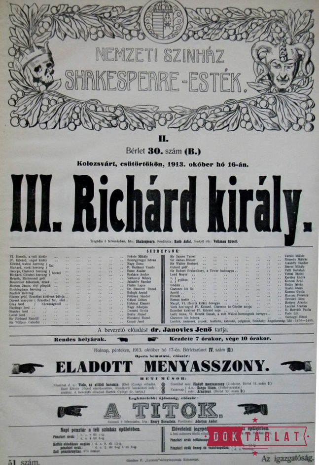 1913. okt. 7: Felsült szerelmesek, okt. 16: III. Richárd király, okt. 30: Makrancos hölgy, nov. 15: Rómeó és Júlia, nov. 27: Velencei kalmár, dec. 16: Vízkereszt, vagy amit akartok, 1914. jan. 5: Julius Caesar, jan. 17: A windsori víg asszonyok, jan. 25: Hamlet, febr. 7: Szentivánéji álom, febr. 27: Othello, márc. 22: Lear király, ápr. 20: Coriolanus, ápr. 23: Macbeth.