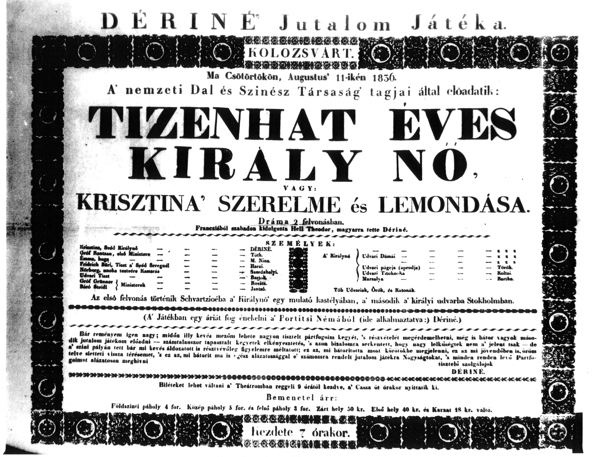 - A tizenhat éves királyné vagy Krisztina szerelme és lemondása, Hell Theodor németre fordítása után, 1836. aug. 11-én volt a bemutató