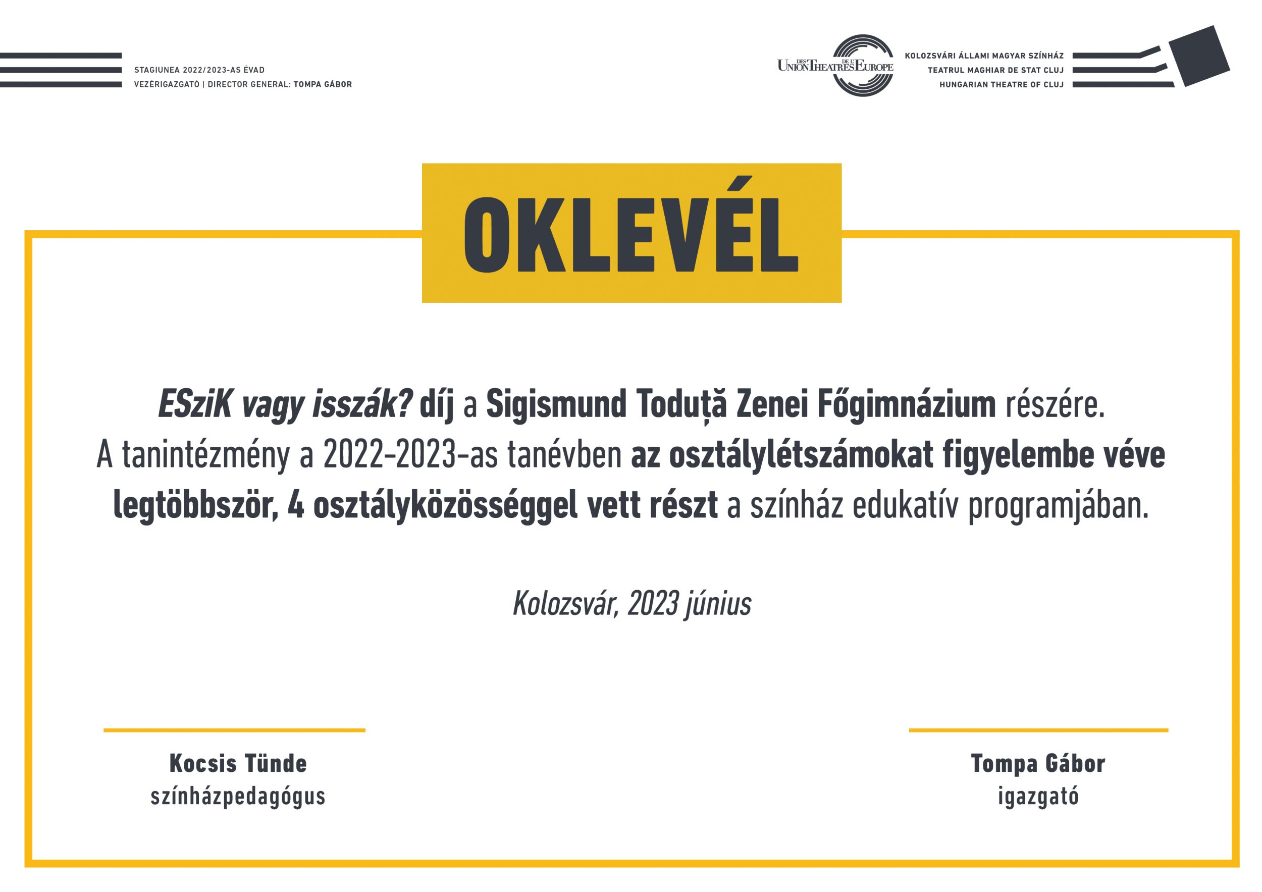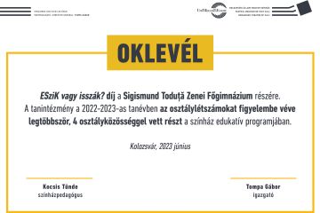 · ESziK vagy isszák? díj a Sigismund Toduță Zenei Főgimnázium részére. A tanintézmény a 2022-2023-as tanévben az osztálylétszámokat figyelembe véve legtöbbször, 4 osztályközösséggel vett részt a színház edukatív programjában.
