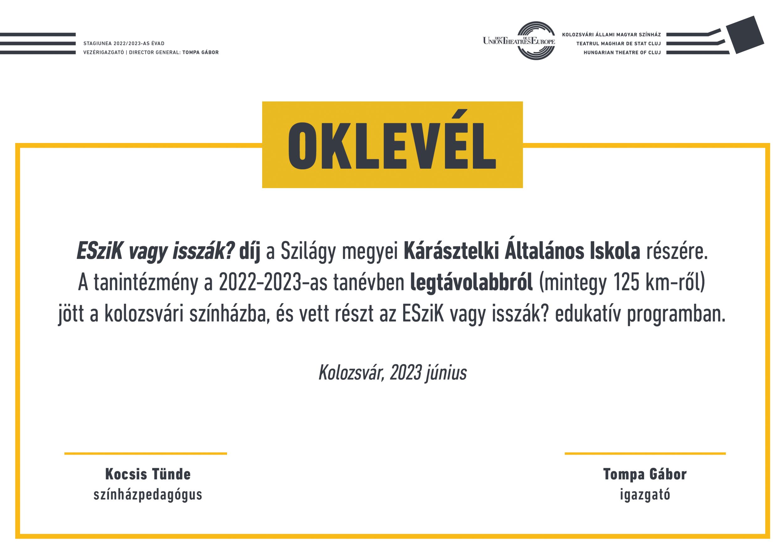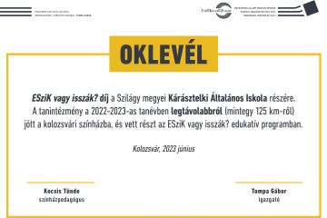 · ESziK vagy isszák? díj a Szilágy megyei Kárásztelki Általános Iskola részére. A tanintézmény a 2022-2023-as tanévben a legtávolabbról (mintegy 125 km-ről) jött a kolozsvári színházba, és vett részt az ESziK vagy isszák? edukatív programban.