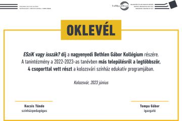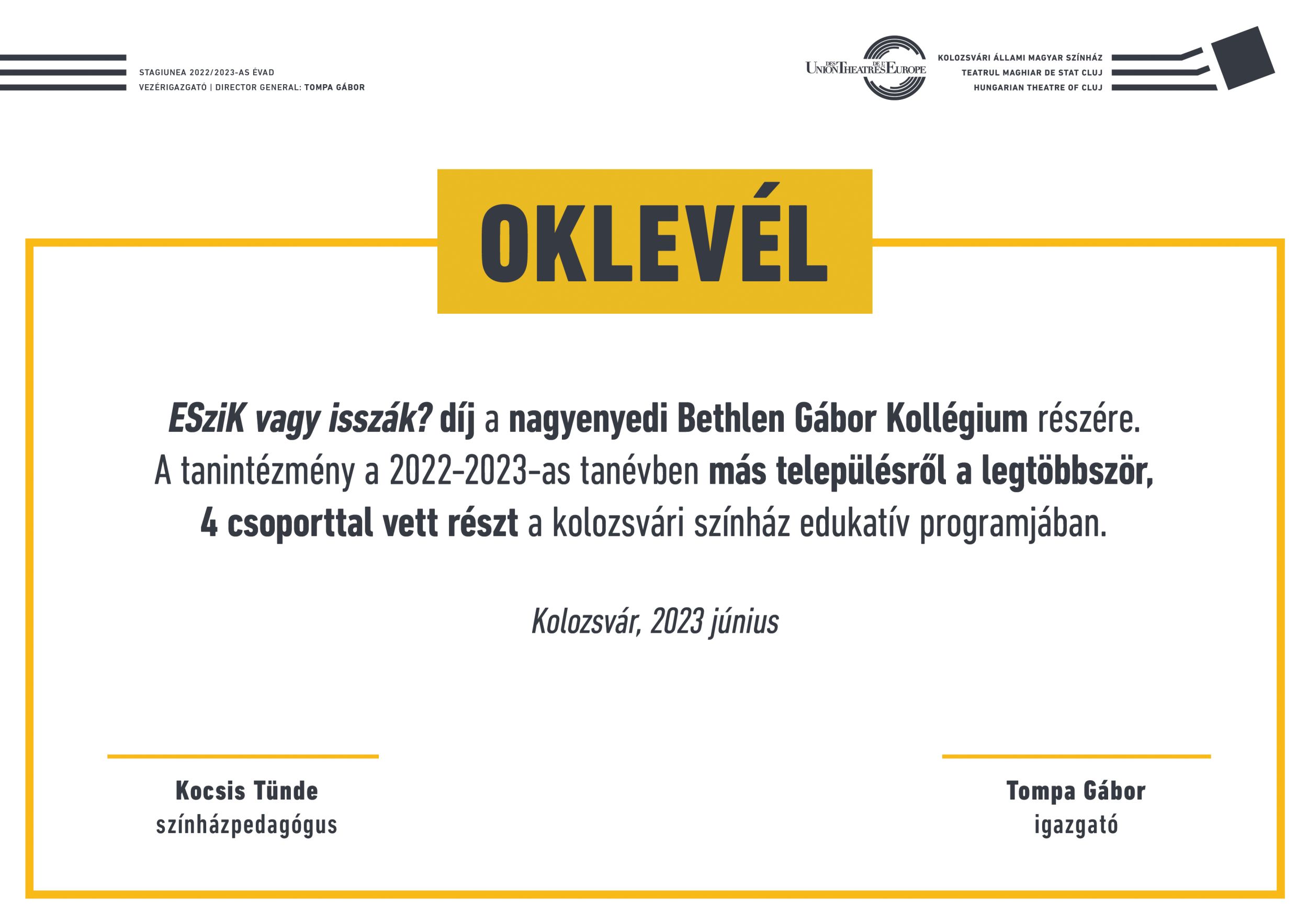 · ESziK vagy isszák? díj a nagyenyedi Bethlen Gábor Kollégium részére. A tanintézmény a 2022-2023-as tanévben a más településről a legtöbbször, 4 csoporttal, vett részt a színház edukatív programjában.