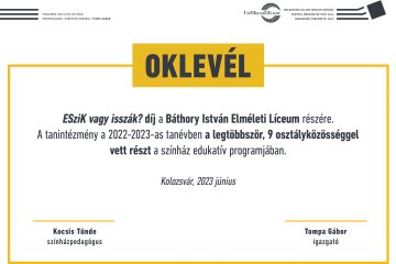 · ESziK vagy isszák? díj a Báthory István Elméleti Líceum részére. A tanintézmény a 2022-2023-as tanévben a legtöbbször, 9 osztályközösséggel vett részt a színház edukatív programjában.
