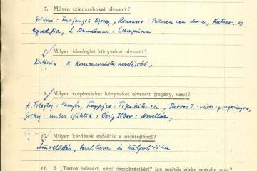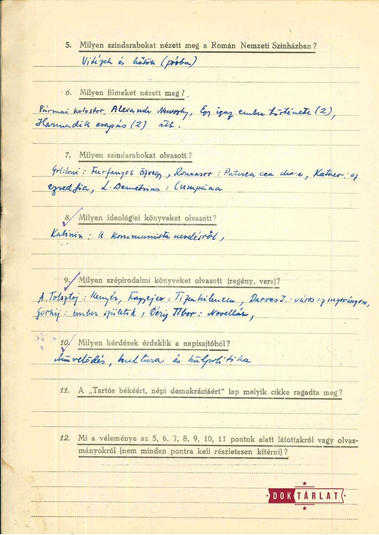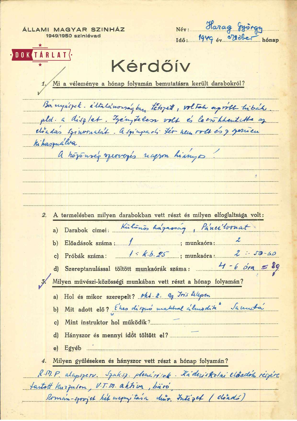 Harag havi kérdőívei azt mutatják, hogy rendszeresen és sokat olvas, az elvárt ideológiai könyveket és szépirodalmat egyaránt, és gyakran részletez egy-egy filmet, ami hatással volt rá. Szinte lehetetlen szétszálazni az elvárt és a személyes véleményeket, a formalizált nyelv mögött a személyes hangot, amikor egy-egy előadás szocialista realista megoldásait, az osztályharc megjelenítését és a szovjet hős erényeit taglalják a színészek, ezeken túl azonban időnként egymás alakításait is értékelik – az irodalmi titkár Jordáky pedig minden egyes színész munkáját. Harag kérdőívei végére gyakran írja oda, hogy „igen sokat fejlődik”; „Sokat olvas. A szépirodalmat meglehetősen rendszeresen. Az ideológiát elhanyagolja”; „Ideológiailag és irodalmilag a legkomolyabb fejlődésen ment keresztül. Ezzel azonban egyáltalán nincs arányban színészi fejlődése. Sőt – ezen a területen teljes a megtorpanás.”