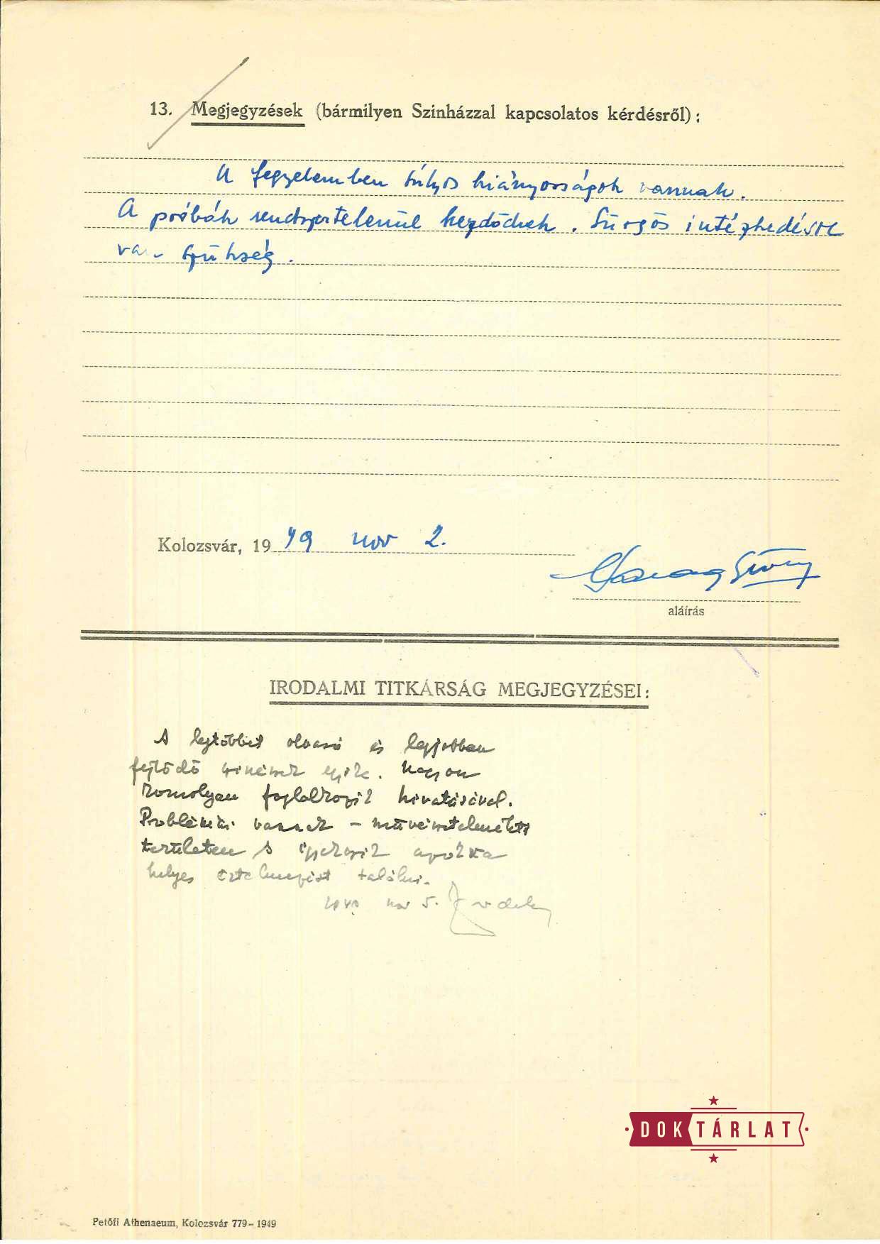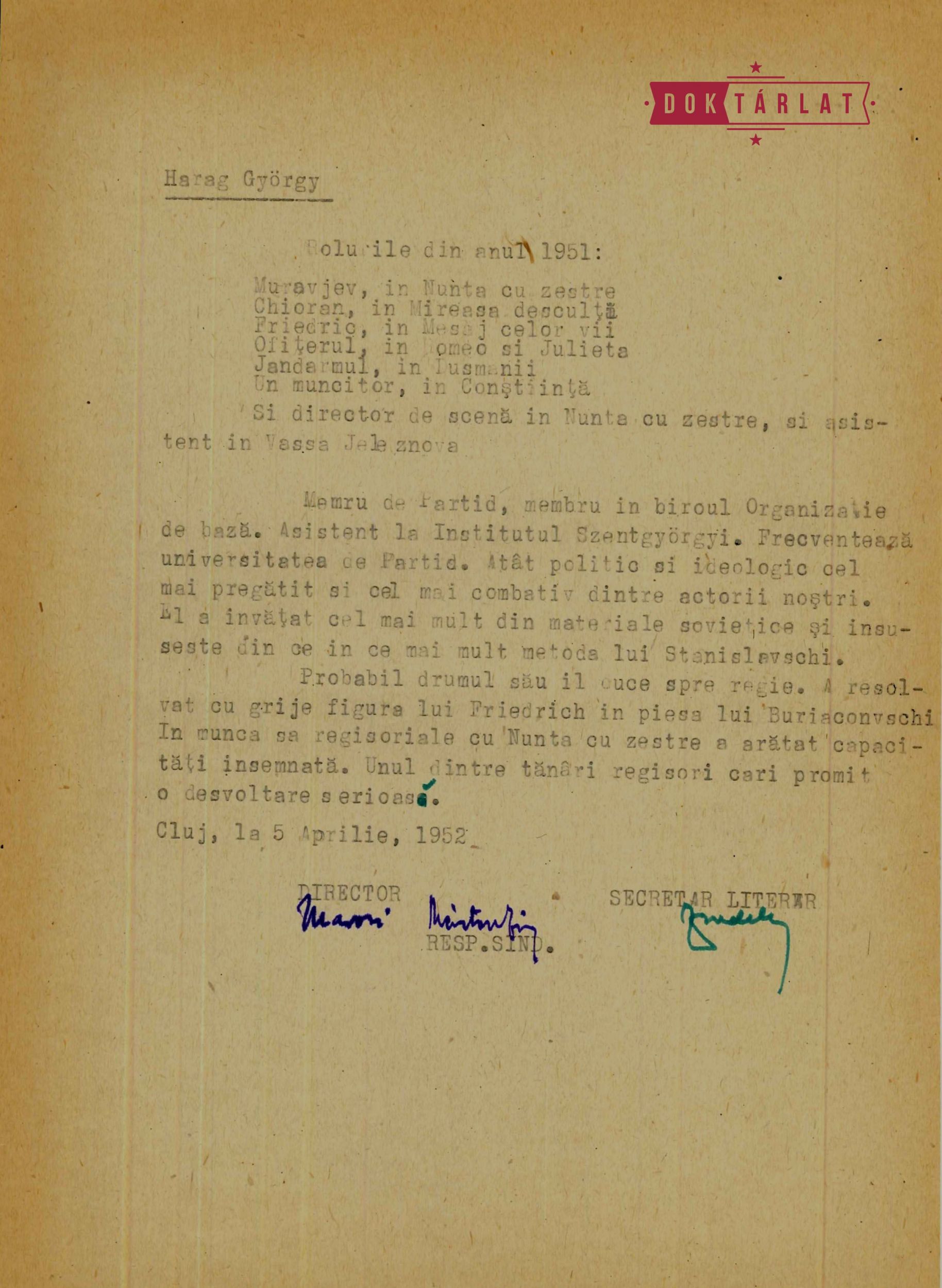 Harag első rendezése a kolozsvári színházban a Platon Krecset, Alkeszandr Kornejcsuk ukrán író drámája, amely nem csak témájában, de kollektív munkamódszerében is megfelelt a szocialista realista elveknek. Az 1949. január 29-én bemutatott előadáson a színház fiatal tagjai próbaidőn kívül kezdtek el dolgozni, a Világosság cikke szerint a rendezőt is maguk választották ki maguk közül.[1] „Valóban kollektív munkát végeztek. Fiatal rendezőjük (Harag György) és idősebb tanácsadójuk (Senkálszky Endre) vezetésével alapos előtanulmányokat folytattak. Együtt néztek meg szovjetfilmeket, együtt beszéltek meg szovjetregényeket, közösen elemezték a darab mondanivalóját”,[2] számol be az Utunk. Az említett új színházi törvény bevezetése után a színházi munka átalakult. A gazdaság tervszerűsítésével egy időben a színházak működését is egy-, illetve ötéves tervekbe kellett foglalni, termelői ülések, viták, kritikai és önkritikai rituálék, cenzori megtekintések előztek meg egy-egy bemutatót. A színészeknek ideológiai szemináriumokon kellett részt venniük, az irodalmi titkárok feladata volt ezeket megszervezni, majd felügyelni és ellenőrizni a színészek fejlődését. A filmnézés vagy regényolvasás kevésbé szabadidős tevékenység, mint inkább az ideológiai nevelés eszköze. Kolozsváron 1948 és 1952 között Jordáky Lajos az irodalmi titkár, aki a társulat tagjainak ellenőrzésére, havi munkájuk felmérésére – és nem mellékesen azért, hogy pontos adatokat gyűjtsön a Román Munkáspárt Kolozs megyei bizottságának, illetve a minisztertanács mellett működő Művészeti Bizottságnak küldött beszámolóihoz és jelentéseihez – kérdőívet állít össze. Bár nem minden színész tölti ki ezeket egyforma alapossággal és sok a megválaszolatlanul hagyott kérdés vagy rövid, semmitmondó, a kor állandósult szókapcsolatait ismétlő válasz, ezek a források mégis sajátos betekintést nyújthatnak a színház működésének hétköznapjaiba.