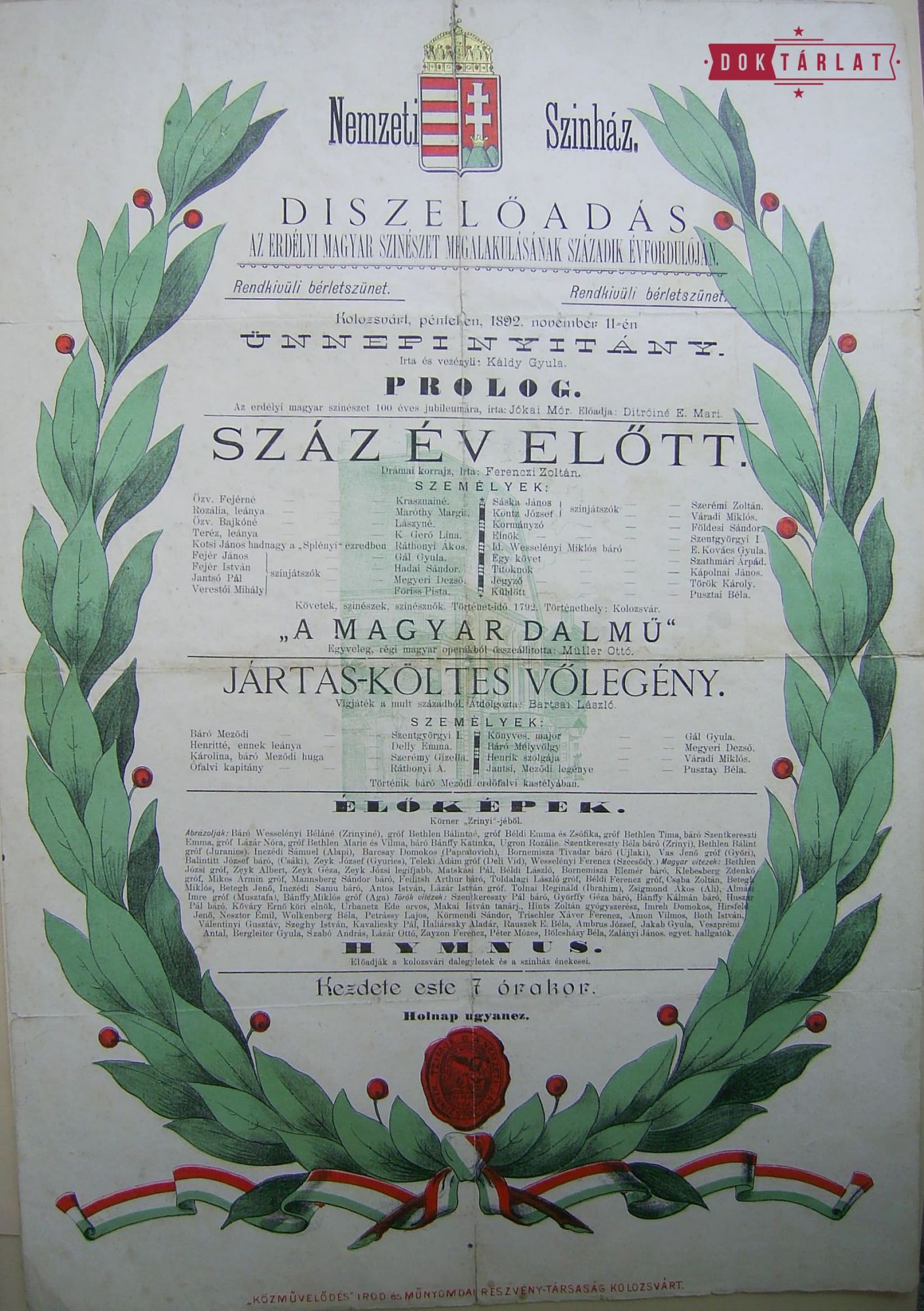 Compania, formată din tineri nobili transilvăneni, a fost înființată în 1792 – la doi ani după ce prima companie de teatru maghiar condusă de László Kelemen a fost înființată la Buda –, iar pe 2 octombrie a primit din partea Parlamentului transilvănean acordul de a juca. O sută de ani mai târziu, în septembrie 1892, Zoltán Ferenczi, care preda la universitate și conducea biblioteca Socetății Muzeului Ardelean, a publicat un articol în cotidianul Kolozsvár despre apropiata aniversare, îndemnând la sărbătorirea acesteia. Așa a început scurta perioadă de două luni în care orașul și teatrul au organizat trei zile de sărbătoare commemorând istoria teatrului clujean. Încă de la început, a trebuit clarificată o întrebare importantă: când a avut loc prima reprezentație din 1792 și, în consecință, în ce zi va avea loc centenarul? Mai multe surse au dat date diferite. Nu se știa dacă 11 noiembrie, 11 decembrie, 16 sau 17 decembrie 1792 a fost data debutului companiei, în Casa Rhédey. În cele din urmă, a fost aleasă ziua de 11 noiembrie, fără îndoială ținându-se cont și de faptul că era și centenarul nașterii lui József Katona, care era legat de teatrul clujean prin piesa emlematică Banul Bánk. Pe invitații era scris: „teatrul permanent maghiar și cel mai mare dramaturg maghiar s-au născut în aceeași zi". În cinstea acestui fapt, în ajunul sărbătorii, pe 10 noiembrie 1892, a fost jucat Banul Bánk. Abia câteva decenii mai târziu a devenit clar că cele două aniversări nu coincideau de fapt, Katona se născuse cu un an mai devreme, iar tinerii actori transilvăneni au jucat pentru prima dată în fața publicului clujean pe 17 decembrie 1792.[1]