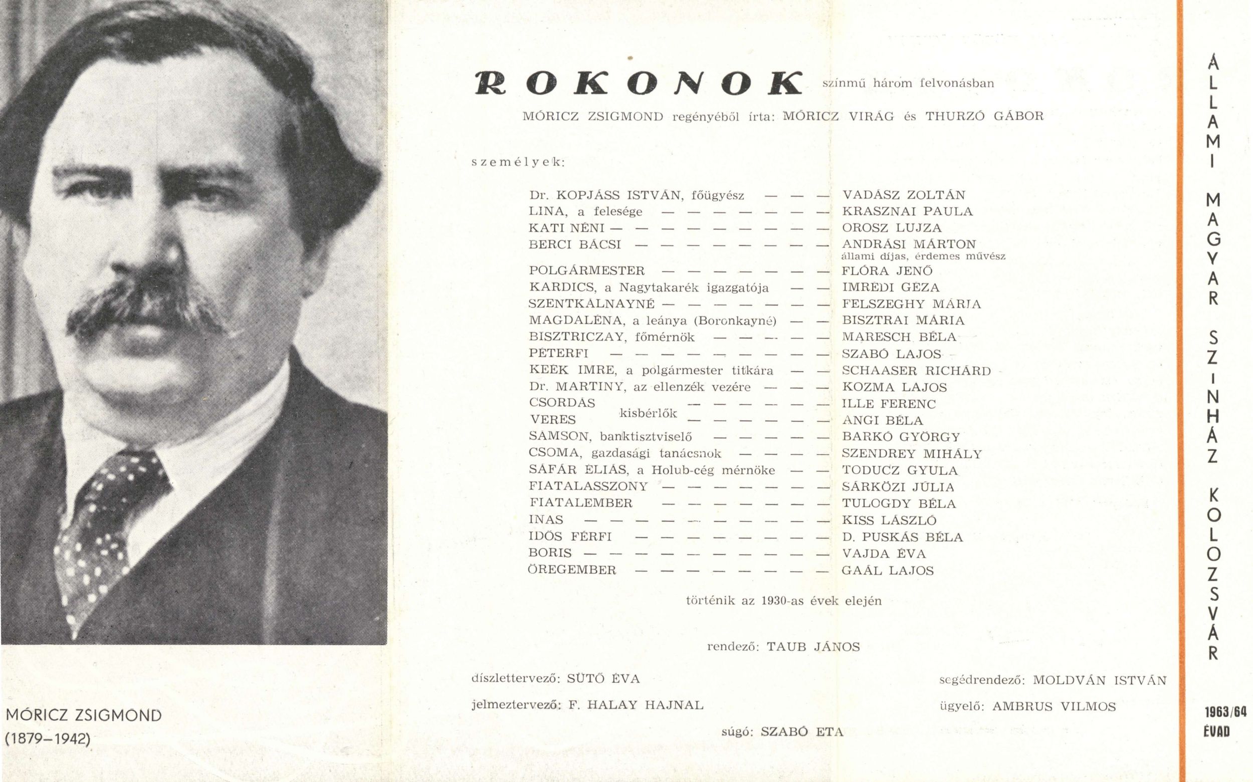 Cu ocazia Zilei Dramei Maghiare, ne amintim de spectacolul Rokonok (Rubedenii) regizat de János Taub, care a avut premiera pe 7 octombrie 1964. Ne înclinăm în fața realizărilor predecesorilor noștri și zâmbim dulce-amărui pentru că, după 59 de ani, actuala montare a lui László Bocsárdi ne face să realizăm relevanța și actualitatea romanului lui Zsigmond Móricz. Ne regăsim în situații nefericite similare și într-o rețea de relații orientate în funcție de interes.